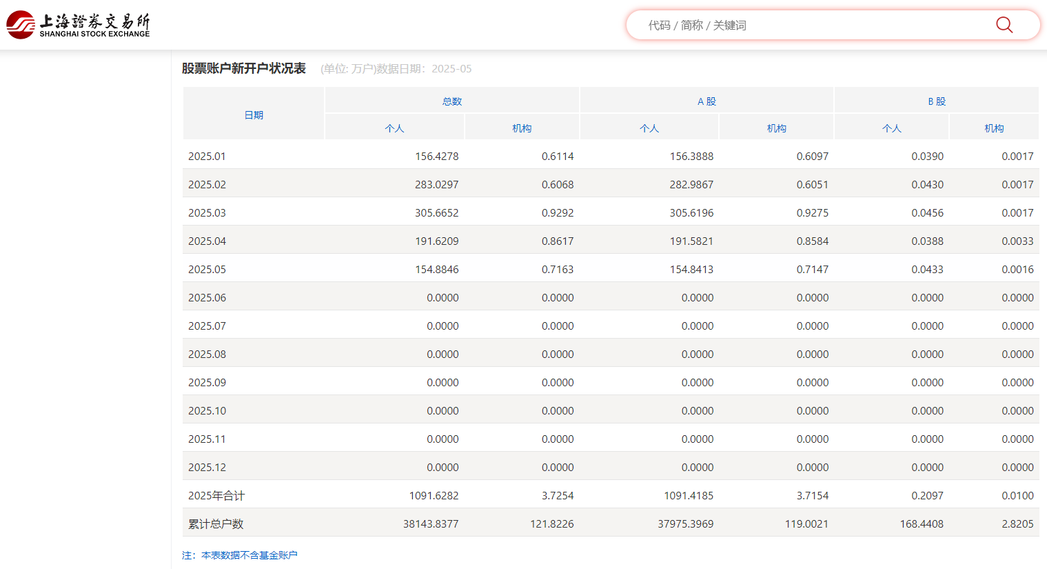 2025年5月,上海交易所个人股票账户新开户154.88万户,同比增加22.86%。与2023年5月相比减少9.53%。