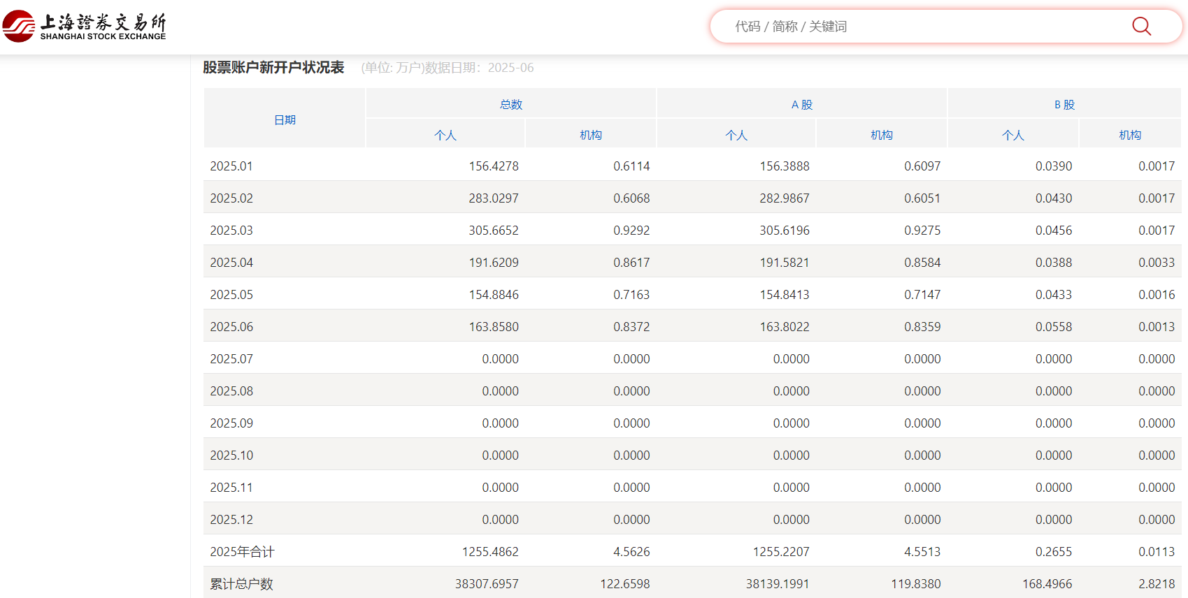 2025年6月,上海交易所个人股票账户新开户163.85万户,同比增加53.03%。与2023年6月相比减少5.86%。