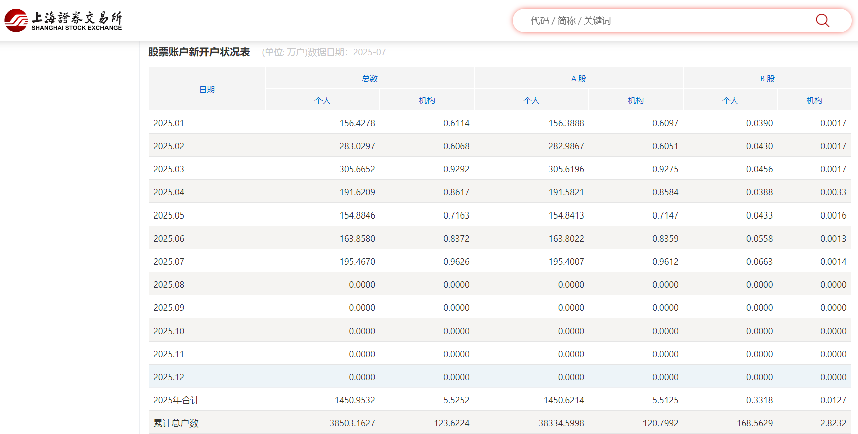 2025年7月,上海交易所个人股票账户新开户195.46万户,同比增加70.63%。与2023年7月相比增加21.06%。