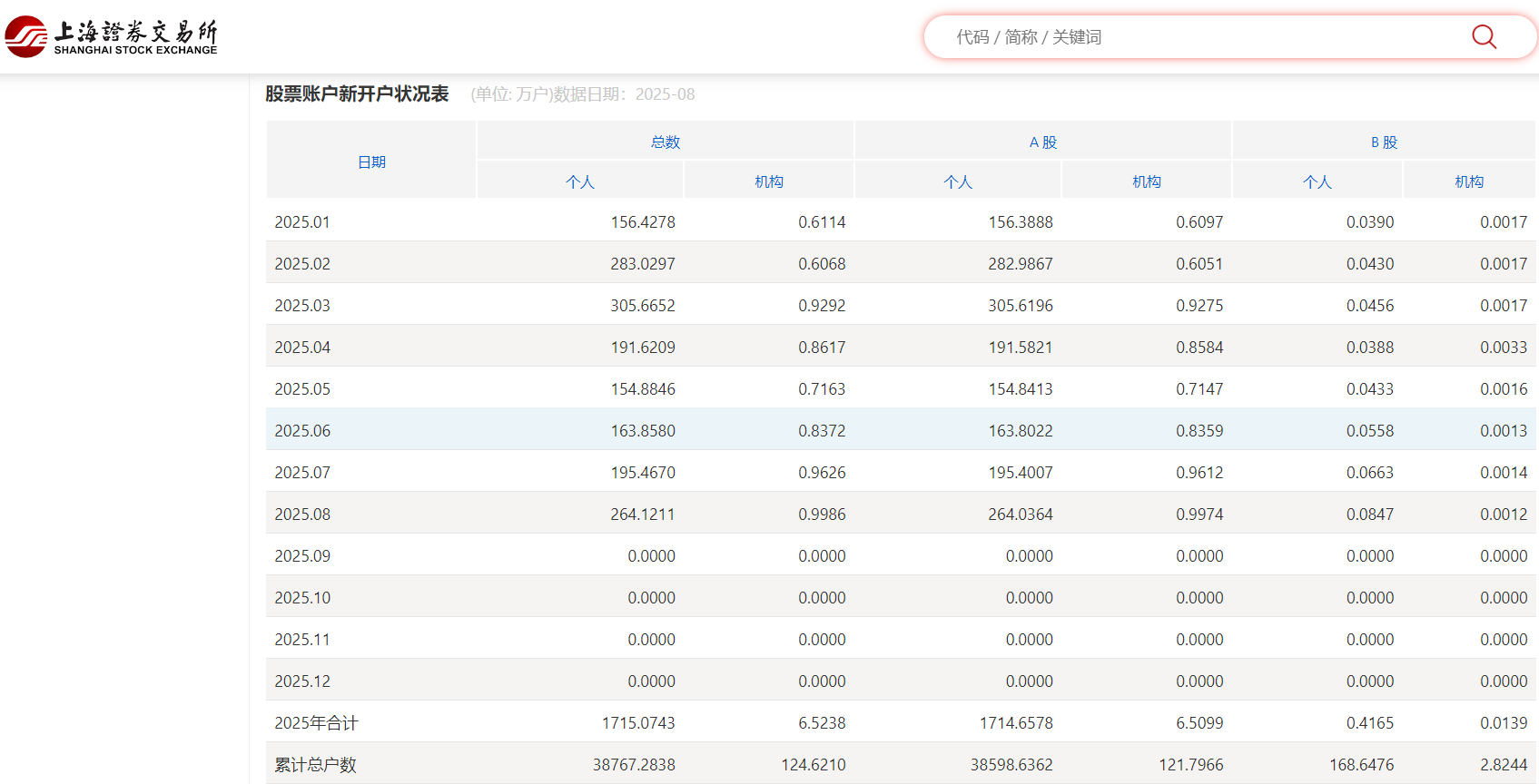 2025年8月,上海交易所个人股票账户新开户264.12万户,同比增加165.57%。与2023年8月相比增加52.17%。