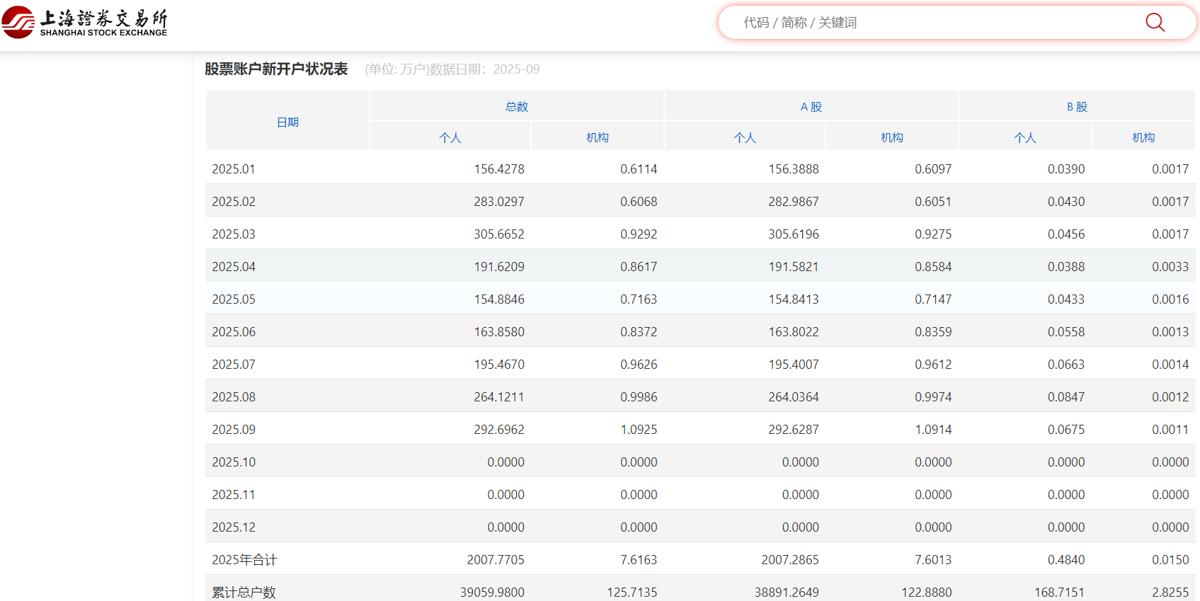 2025年9月,上海交易所个人股票账户新开户292.69万户,同比增加60.64%。与2023年9月相比增加119.79%。