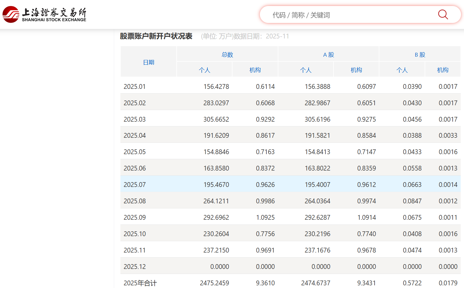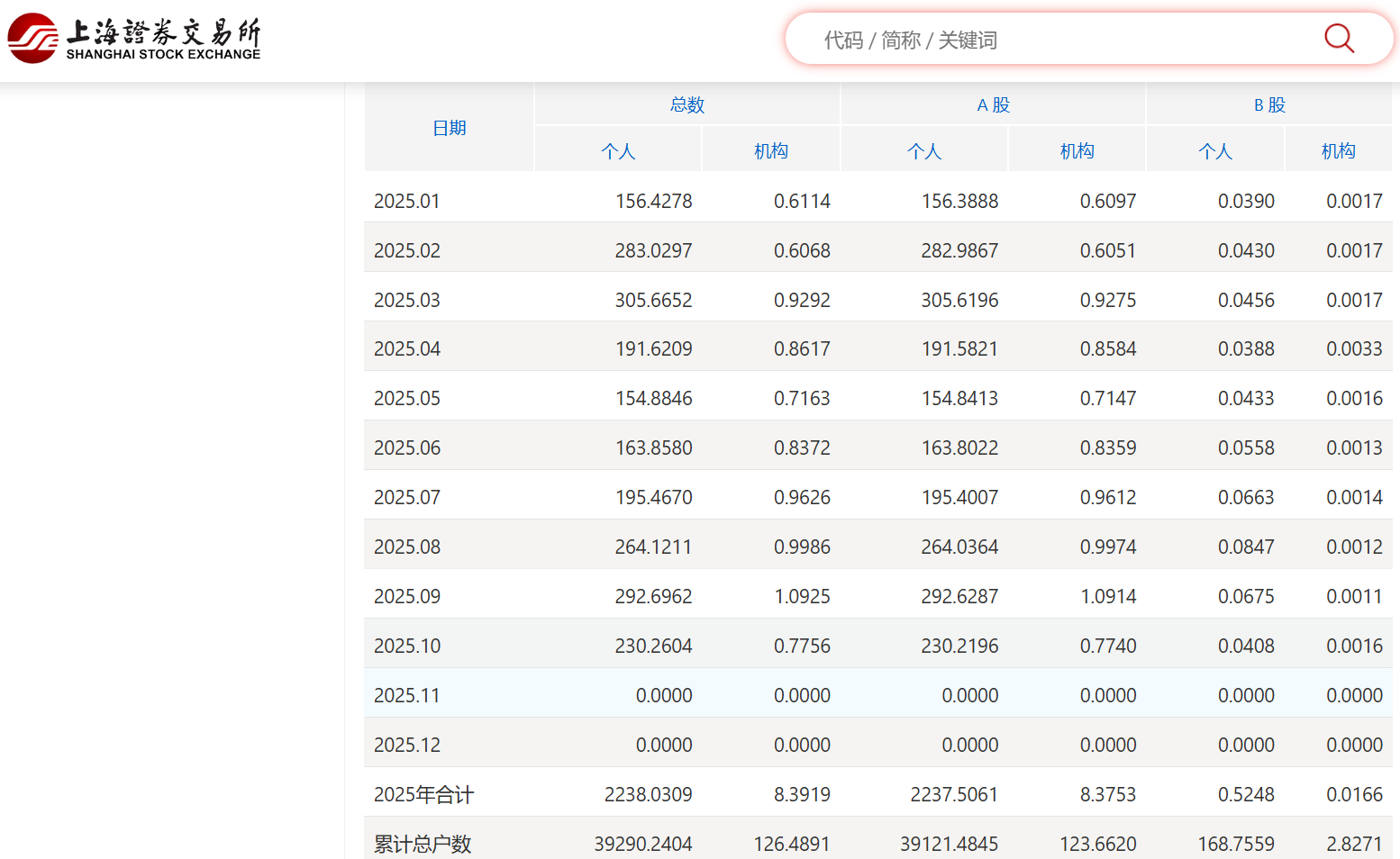2025年11月,上海交易所个人股票账户新开户237.21万户,同比减少11.87%。与2023年11月相比增加77.99%。