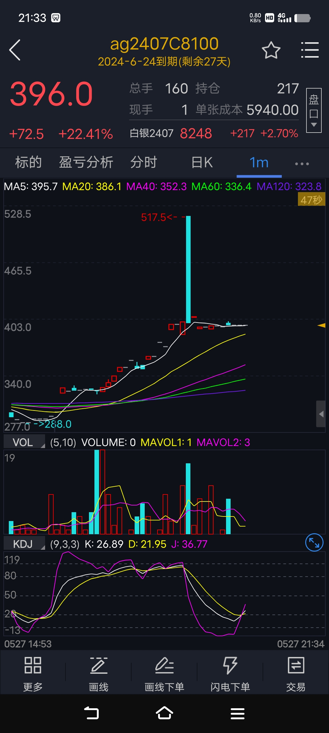价差140有什么说法吗?日盘的140价差单在下午平掉了,获利几百,主要原因是只能单腿交易,平掉一方时,另一方掉的太快,影响收益。夜盘又建仓几手,平均价差大概在132左右,晚上实在太困,就没管了,早上看,价差大概在103左右,但这只是帐面利润,变现起来有难度,主要是十月滑点大,等十月成交后,八月的单子又起来了。这个反日历价差其实演变成了抢钱游戏,比手快。大家操作这种一方滑点大的组合,有什么好的方法吗
