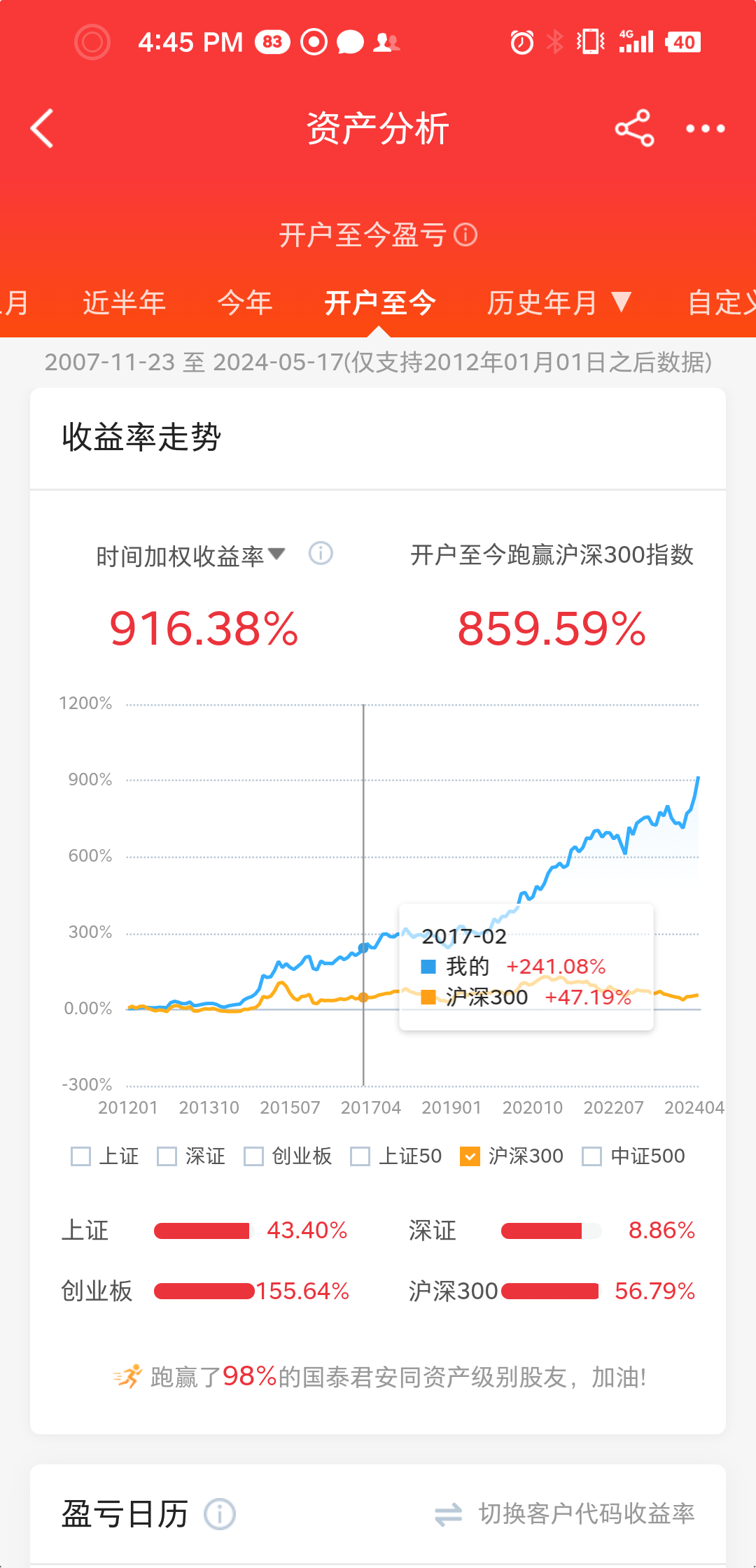 07年入市,早期没记账习惯,券商的历史业绩从12年开始算,到这个月终于净值上10了,前五年净值就上3.3了,又花了七年才到10,如果下一个十二年还能十倍也满足了。