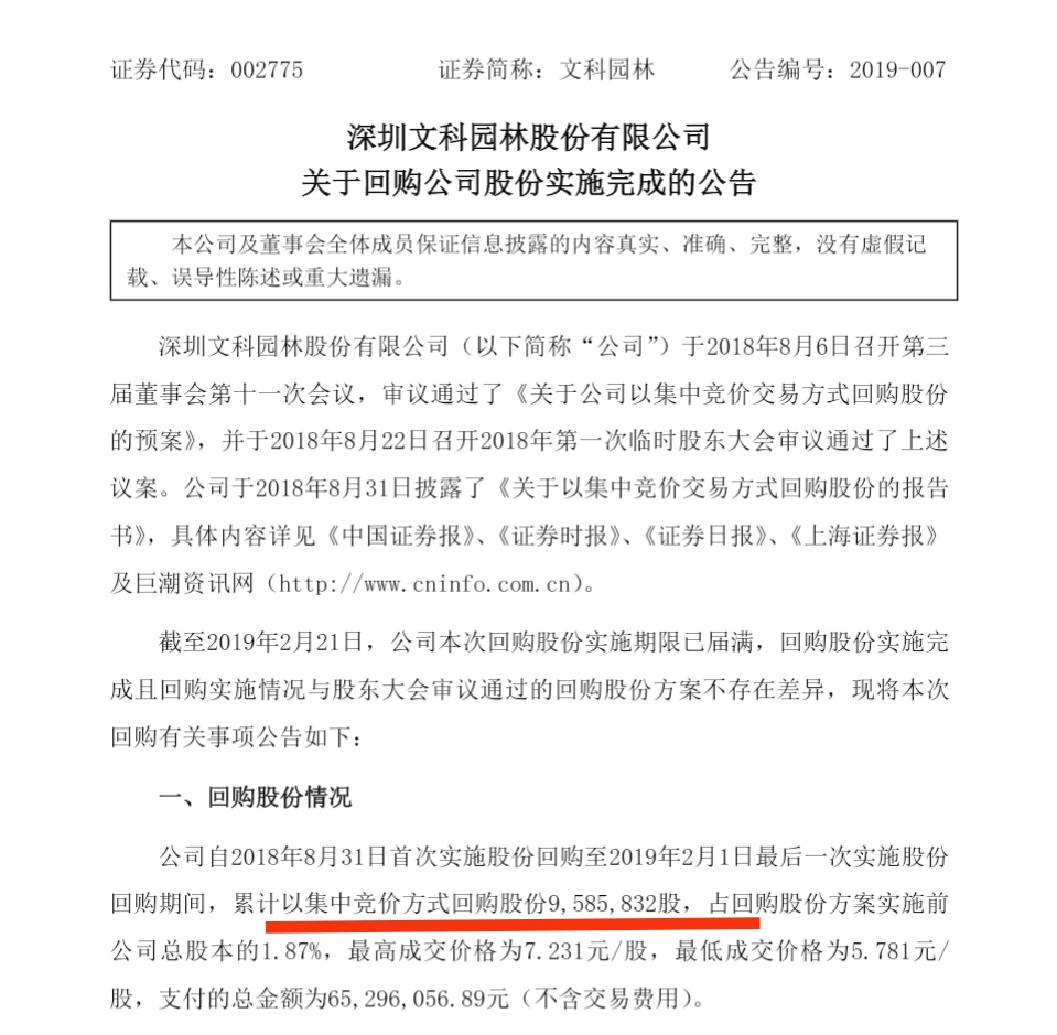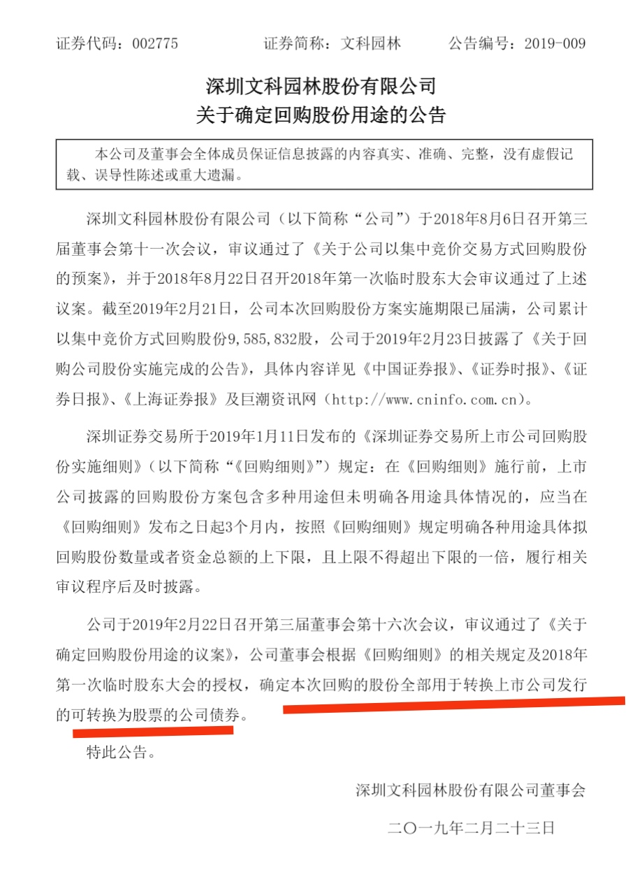 文科园林,2019年2月23日完成回购,回购股份9,585,832股,用于可转债转股,违反公司法