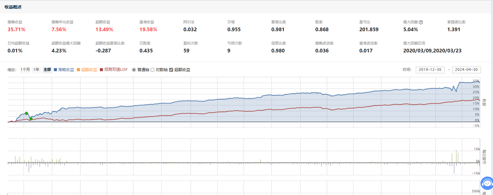 然后我登录几年没上的聚宽,在抄袭哦不在借鉴的基础上写了这么一个3000点进场的回测:大部分的时间是持有招商双债,然后上证指数跌破3000点开始入场。分享给集有们。
