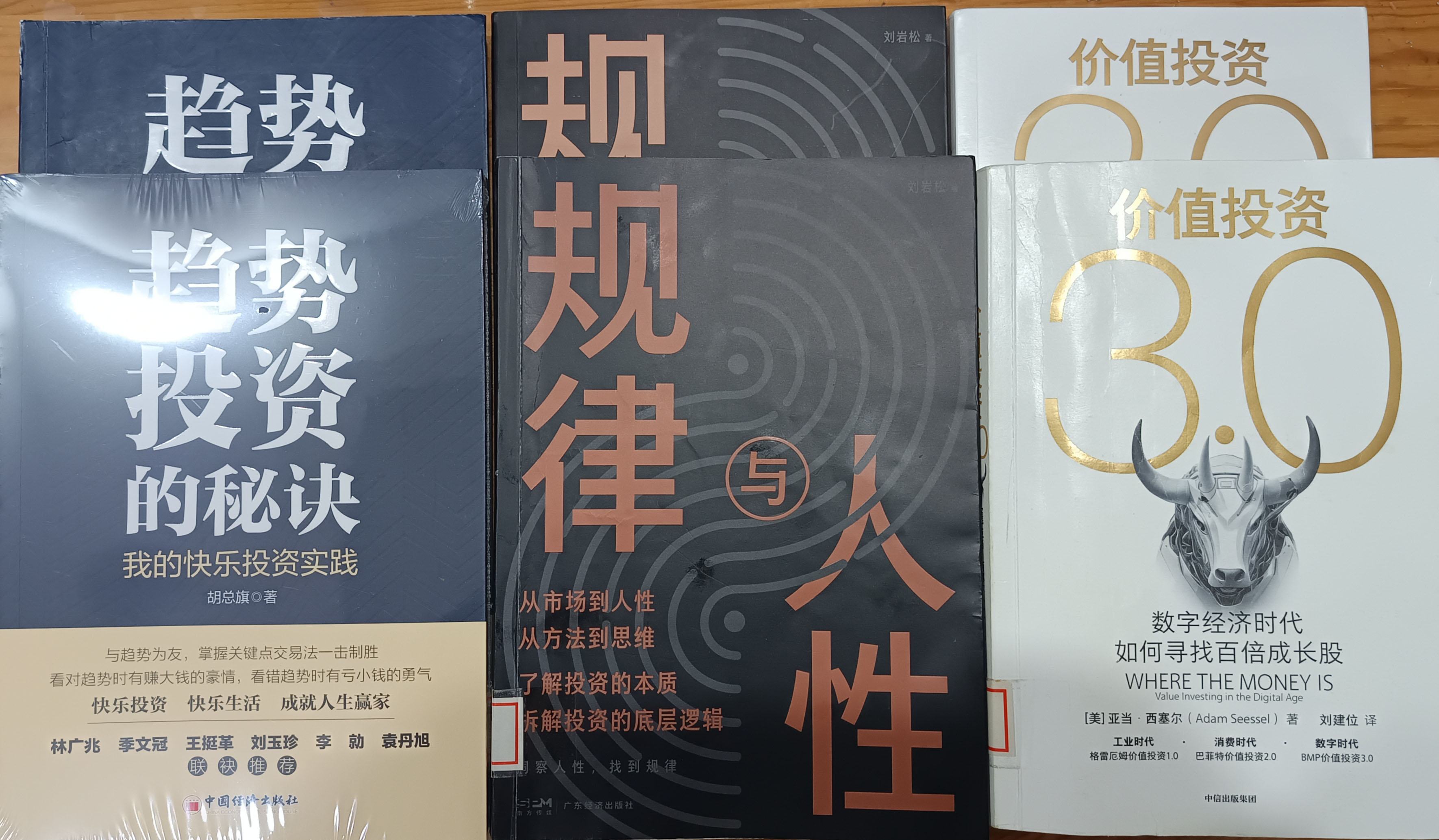 深圳龙岗图书馆的书可以在我家借半年以上(一家人四个图书证转借)就足以证明我是多么喜欢这几本书,趁着双十一全部买了回来。只是我有个毛病,借的书我一般会多看多读,甚至做笔记。而买来的书多半就到书柜吃灰了,只有想起来才去看看翻翻!!就算这样还是坚持买回来收藏吧,也当作对作者的敬意!!三本书两个方向。写趋势的我有点不是很理解,但这本书确实比较接地气。而规律与人性这本书上面写的规律我基本都懂,甚至我也在用类似的方法在选股票,给股票打分。价值投资3.0,一直有在看,只是今年没有按照这个方式(价值投资3.0)去买股票,真的感觉自己后知后觉,如果我照着这个方式选股,今年的收益最少大幅跑赢指数!!
