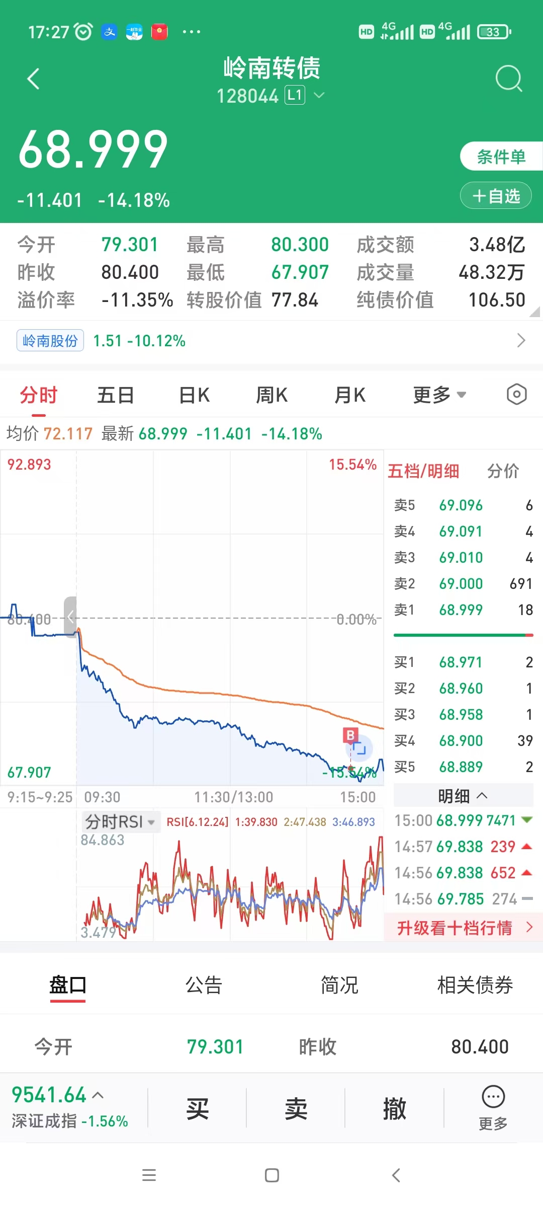 昨天深圳中考成绩出来,小朋友考试没有达到我的要求,但他尽力了,也达到深圳B+线中部,只是不知道这个分数线能上什么样的高中,昨天成绩一出来,都没有心思看盘,结果下午发现广汇跌停了,哎,又多亏了壹仟多!!收盘前连忙把岭南转债看底牌的清仓了,结果今天上午起来发现100多50张条件单触发(但是没有票了),没有办法,技不如人!!
