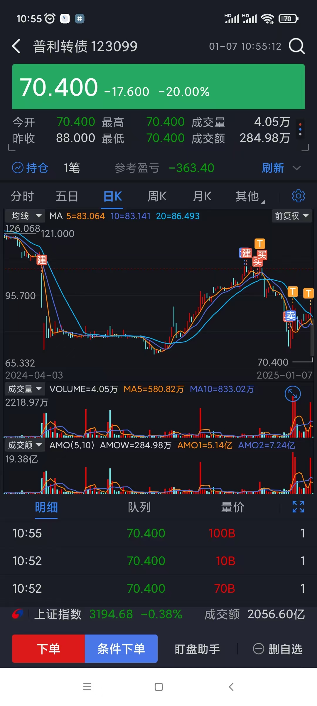 还好昨天忍住没加仓,运气好普利转债退市早就是明牌,只是不知道证监会这个板子什么时候下来。我一月在天桥看大力丸游戏,买了几百张。结果掉在坑里了,接下来一直在日内做T,中间80多成本清了一次,后面又大跌,继续做T,终于把成本降到60多。每周五都怕板子打下了,在3月7号基本没有亏本清了大部分。10号左右走完了。赚了一点。当时确实没有想到下修(加公司配合拉正股)搞了一块这么大的肉下来。少赚了几千,但也有可能我赚了几千,又更加贪婪,现在还没有走完或者是买回来了。那现在铁定退市,就可能会亏得更多。