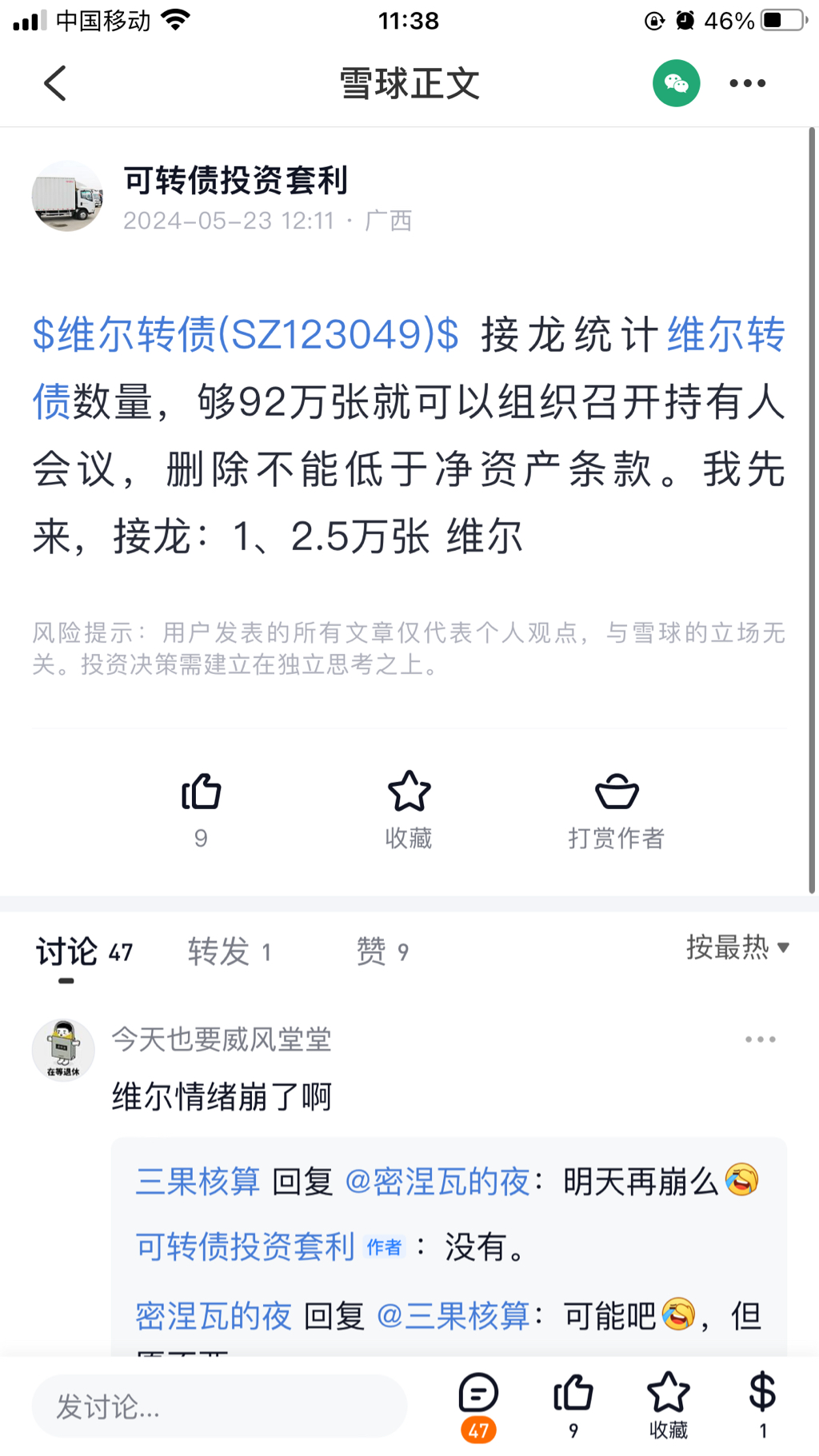 谴责恶意投诉!首先,我没买维尔转债,我认为维尔转债的做法会影响到其他公司,大家纷纷效仿导致回售条款失效会对以后整个转债市场造成不利影响,我在维护整个转债投资人群体的利益,也可能是以后你的利益。