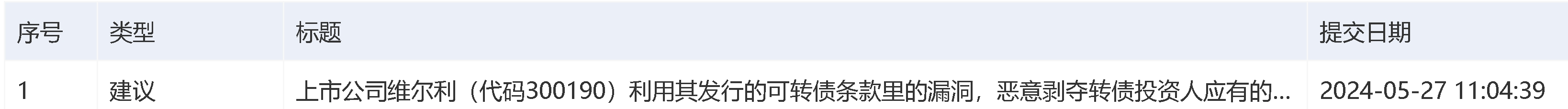 跟新完善一下一起投诉到交易所、证监会维尔利恶意剥夺债权人权利尊敬的交易所、证监会:上市公司维尔利(代码300190)利用其发行的可转债条款里的漏洞,恶意剥夺转债投资人应有的回售条款的权利,情况如下:根据募集说明书里面的回售条款:回售条款 (1)有条件回售条款 在本次发行的可转换公司债券最后两个计息年度,如果公司股票在任何连续三十个 交易日的收盘价格低于当期转股价的 70%时,可转换公司债券持有人...真搞笑