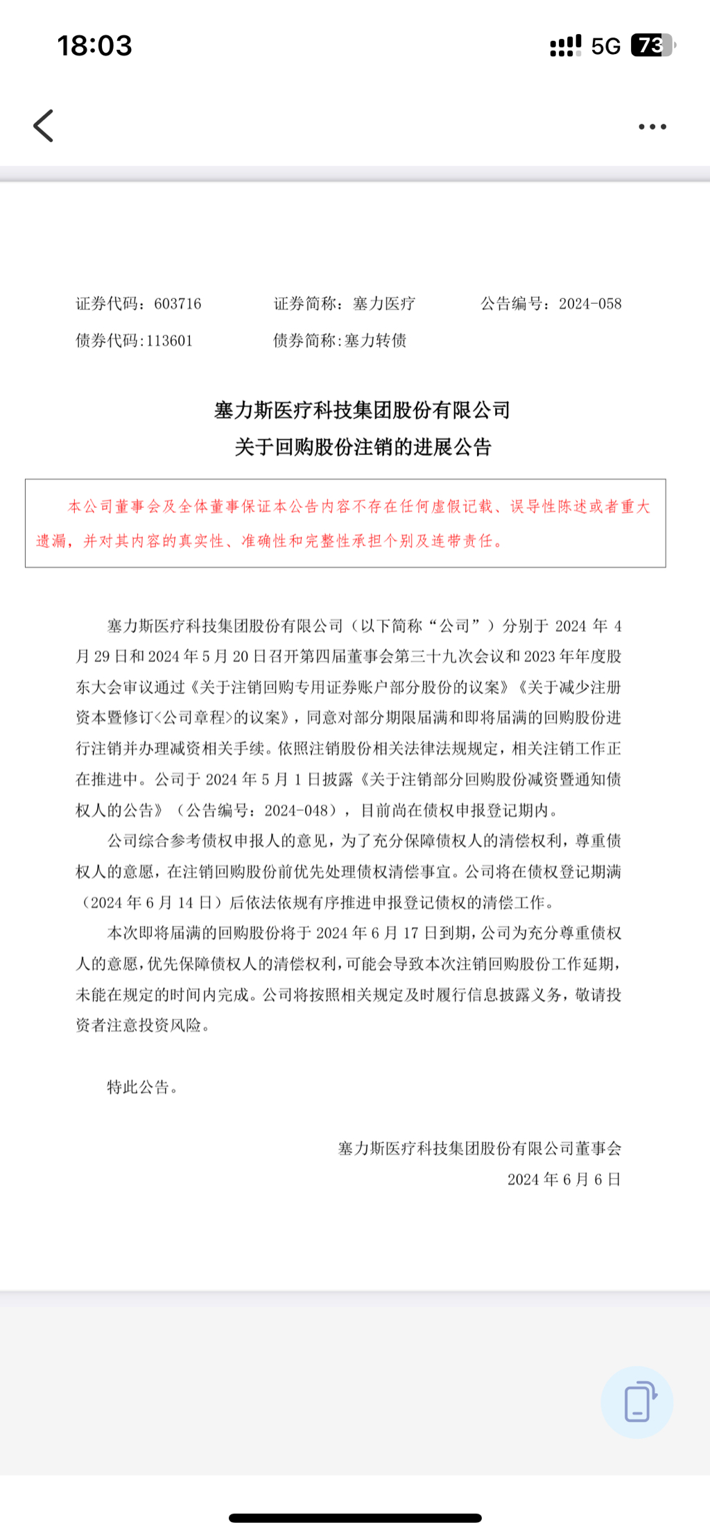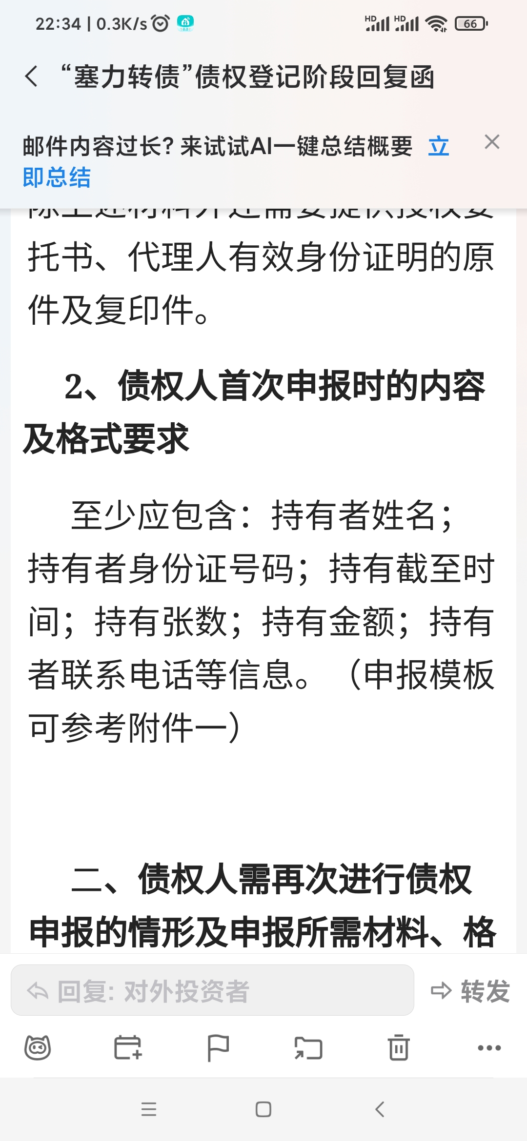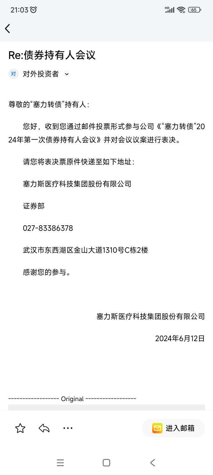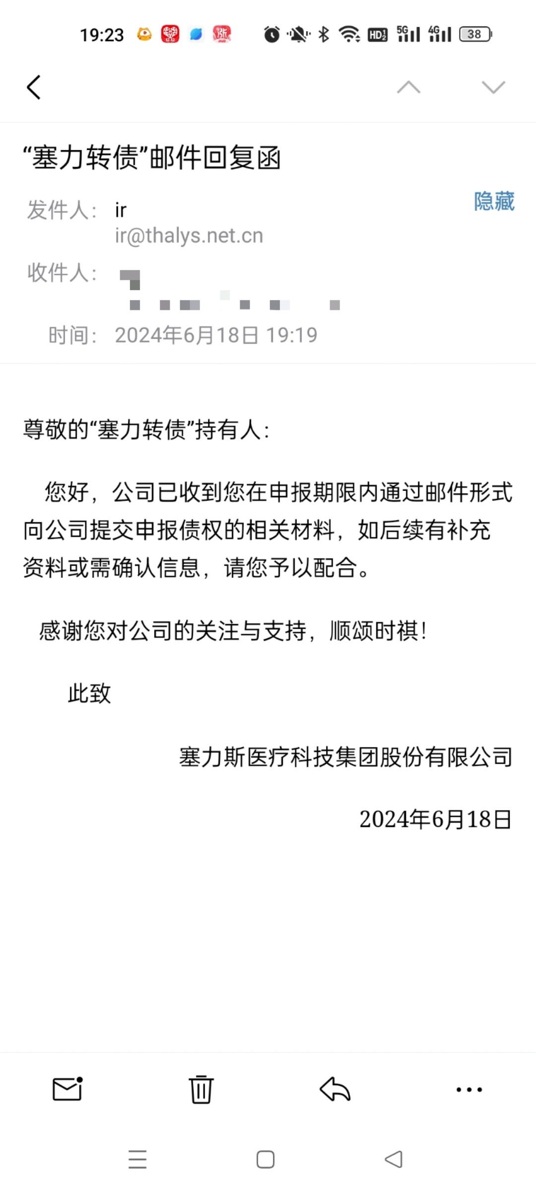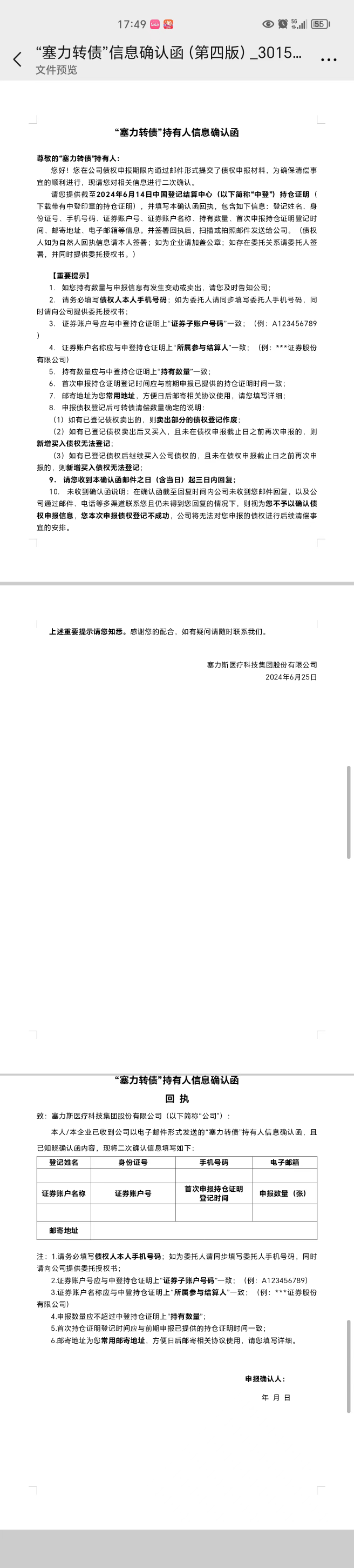 要重新申报了,她奶奶的,必须要有手机号。。。收到邮件要求的格式。附件一:申报参考模板致:塞力斯医疗科技集团股份有限公司(以下简称“公司”):本人/本企业为“ 塞力转债”持有者_,身份证号码:_,截至2024年_月_日本人/本企业持有“塞力转债”_张,现向公司申报债权登记金额为_元。本人/本企业联系方式(电话号码):_附件为:1.本人/本企业身份证明文件(身份证或营业执照原件及复印件);2.本人/...