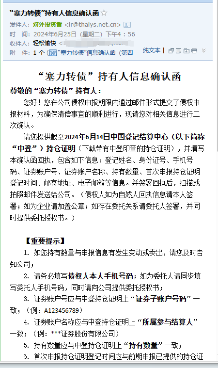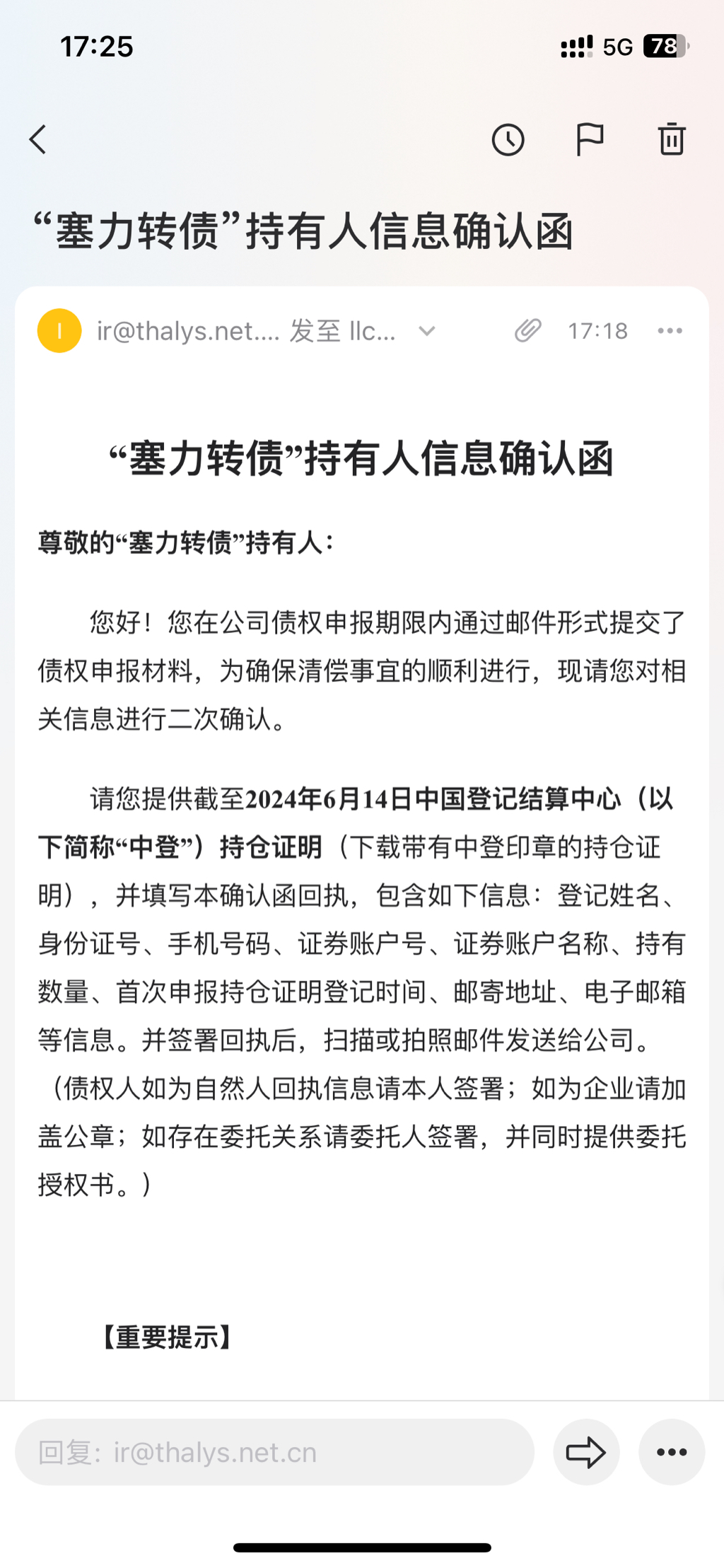 中登持仓证明不止塞力一个持仓。一起发过去不影响塞力转债的清偿吧