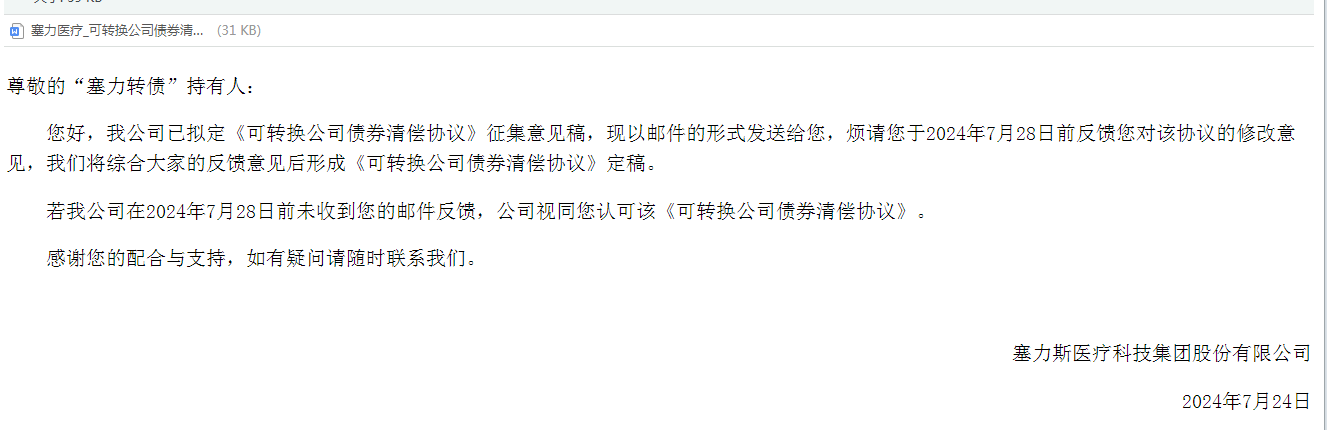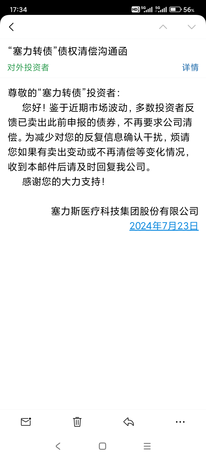 Close 1、塞力转债:申报电子邮件已发送,已有邮件回复;追加的份额进行了补充申报,已有回复;保险起见,追加发出邮政挂号申报。申报结束后的6月18日,发出电子邮件沟通函要求了解清偿时间安排,没有答复。0626致电公司了解情况;0627收到二次确认函,已填写回复。0628塞力公告需要3个月完成清偿,并存在不确定性。只能静观其变。0809塞力发来清偿协议模版,本人认为显示公平,去信就不合理条款要求变更,等待答复ing; 0905下修不到底,0809发去的对清偿协议提出意见邮件也没有答复,准备着手投诉。0907发出修改版清偿协议征求塞力公司意见0910塞力公司答复拒绝,只能使用格式模版 0919寄发格式模版的清偿协议。1010塞力发来邮件启动清偿资料最终确认,本人按邮件要求扫码填报信息、邮件寄发中登持仓及流水证明。1012塞力发布公告,称资金已经到位1024清偿款到账,此案终结。