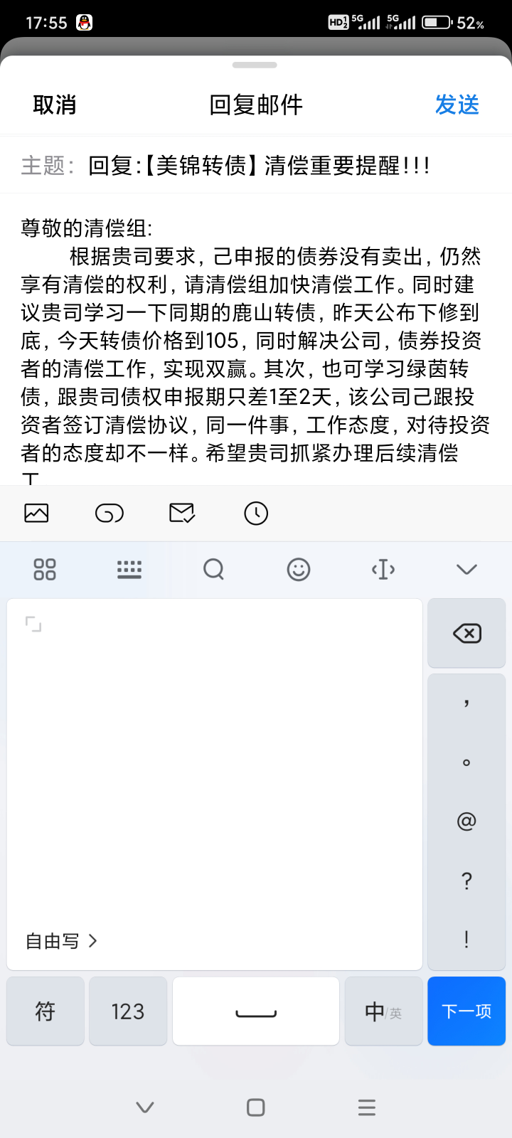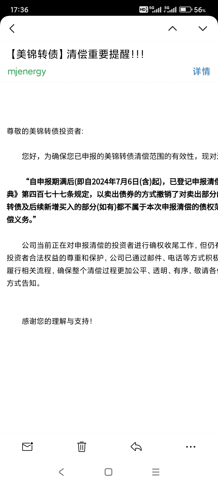 申报电子邮件已发送,当日收到邮件收到确认;0730收到邮件要求确认清偿并提供持仓证明;0730晚,已邮件答复参加清偿并提供持仓证明;等待后续安排ing0907寄发沟通函了解进度,公司很客气次日邮件答复并专门来电解释正在推进。1115答复放弃清偿。