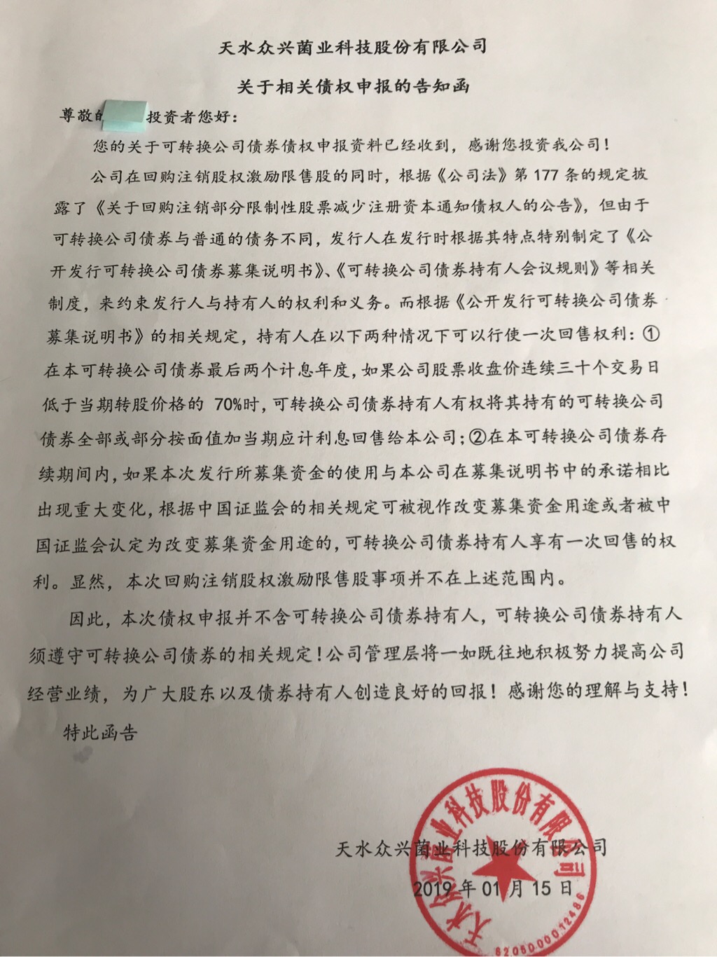 近期减资清偿比较多,回想起2018年我首次参与众兴转债清偿,申报债券后,众兴蘑菇以书面方式拒绝认可转债的债权。贴上当年众兴的答复,大家可以围观品鉴一下,观赏下众兴公司的水平和能力。应该给目前清偿的上市公司转发学习。