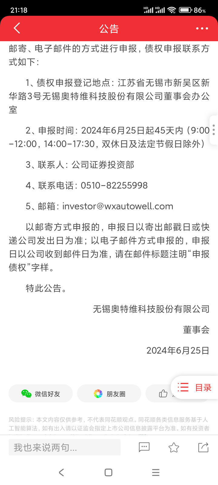 永创智能(代码603901)2024年6月18日发布了《关于拟回购注销部分限制性股票通知债权人的公告》(公告编号:2024-035),公告明确了债券持有人具有提前清偿的权利,可采取现场、邮寄、传真的方式进行债权申报,但实际沟通中要求必须采用现场的方式申报。在电子通讯技术高度发展的今天,仍然选择这种落后的申报方式,无疑增加了申报人的申报成本,把一大群中小文科转债持有人拦在了申报的门外。