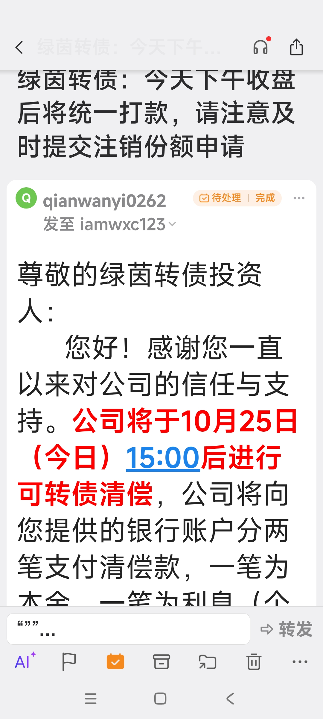 我好像没收到绿茵的最新扫码邮件啊?请见10月18日绿茵发来的邮件,“请通过点击链接(https://XXXXXX/)或扫描附件一中的二维码进入表单页面。该表单用于收集您的清偿账户详细信息(账户信息可从您开具的中证登持仓证明文件中查询),以便公司再次核对后确认最终的清偿信息并注销对应的转债。请务必认真阅读并仔细填写,以确保所提供的信息准确无误。任何错误的信息都可能导致无法完成清偿及注销。”