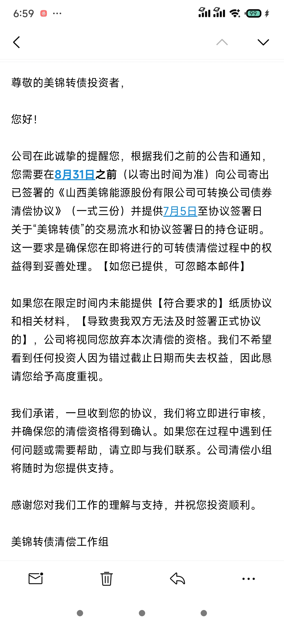 公司在此诚挚的提醒您,根据我们之前的公告和通知,您需要在8月31日之前(以寄出时间为准)向公司寄出已签署的《山西美锦能源股份有限公司可转换公司债券清偿协议》(一式三份)并提供7月5日至协议签署日关于“美锦转债”的交易流水和协议签署日的持仓证明。这一要求是确保您在即将进行的可转债清偿过程中的权益得到妥善处理。【如您已提供,可忽略本邮件】