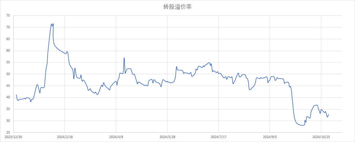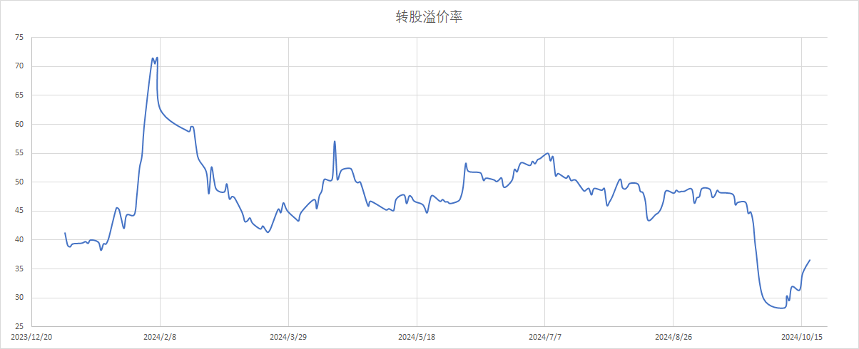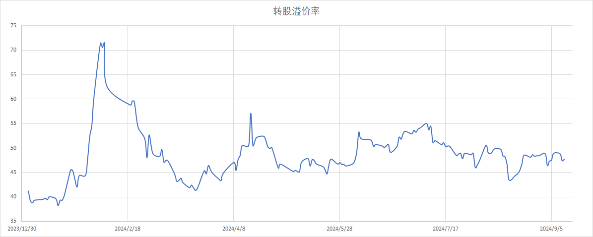 转股溢价率处于最近四年多的较高位置,说明若正股上涨、转债的跟随程度较低(需要先把转股溢价率降下去)。