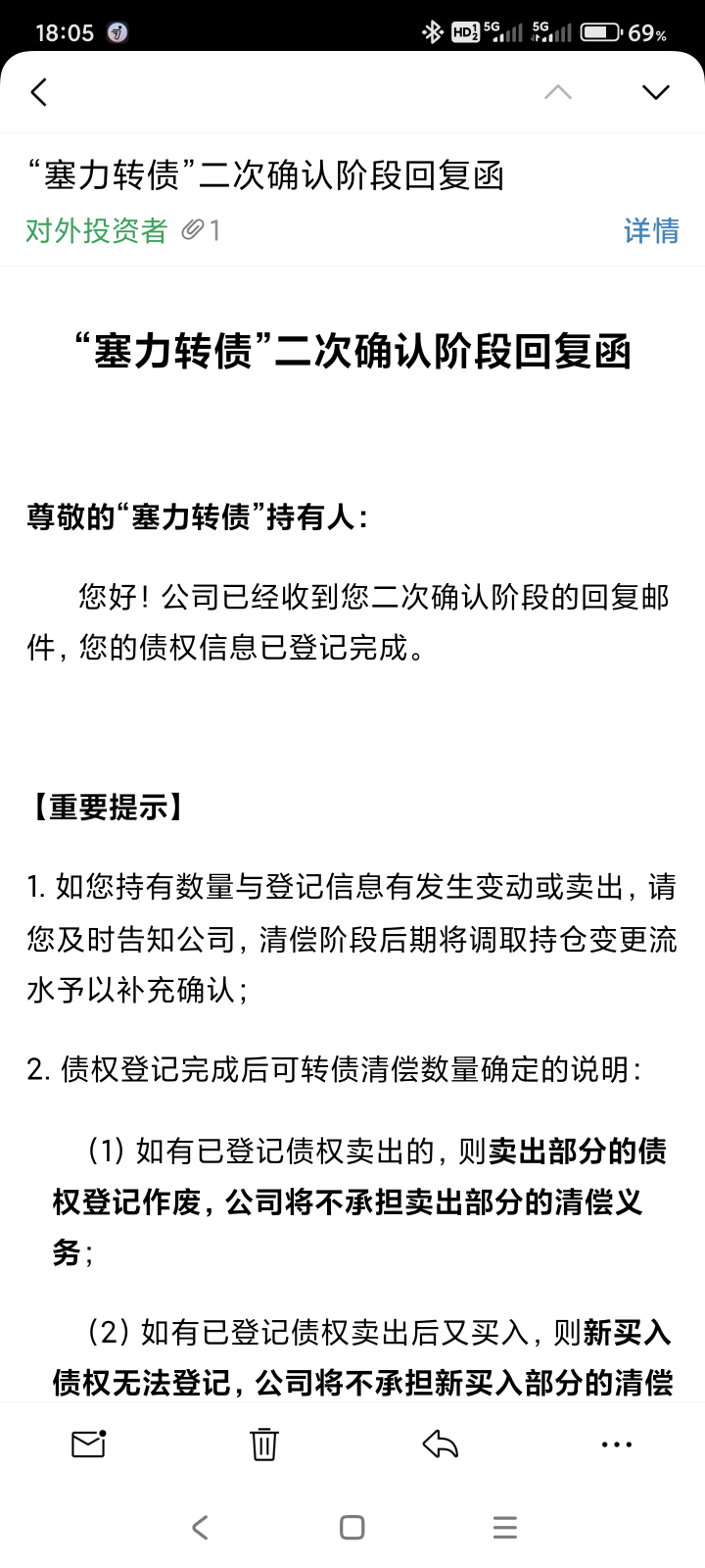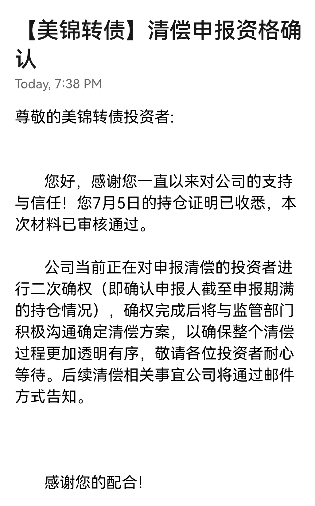 收到美锦清偿申报资格确认邮件了,公司目前正在对申报清偿投资者进行二次确权