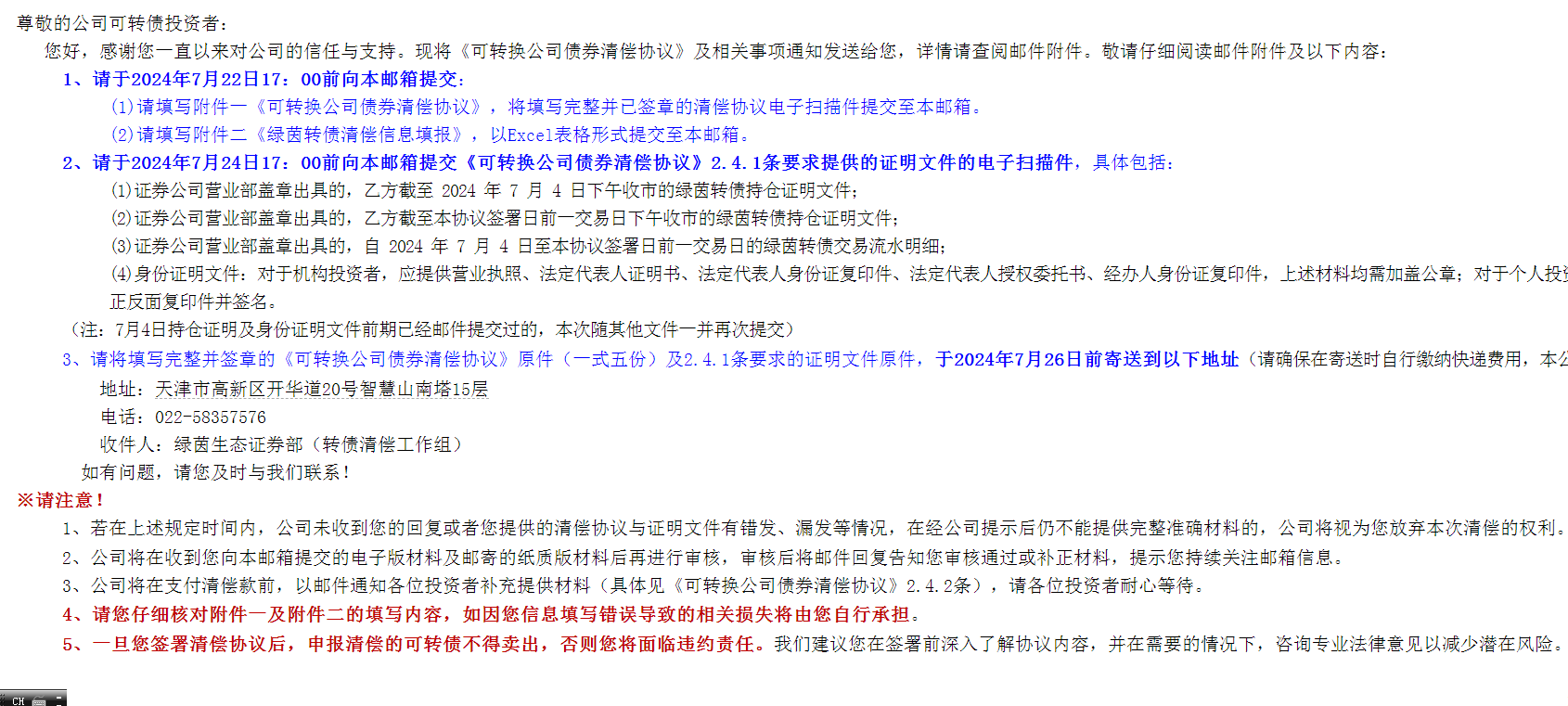 清偿协议内容详见附件一,需您在仔细阅读后亲笔签名,并确保您填写的内容准确无误。请注意:“自本协议签署之日起至标的转债注销完成期间,如您针对标的转债进行转让、行使转股权或设定第三人权益(例如抵押、质押)等操作导致中证登可注销数量少于标的转债数量的,将必然导致中证登无法注销您所持的标的转债。如您实施前述操作,视为主动放弃本次全部标的转债的提前清偿,因此在签署协议后至清偿注销完成前请勿处置标的转债。”协议一式三份,因此您需要签署三份协议,并将所签署的协议于2024年8月31日之前寄送至以下地址: