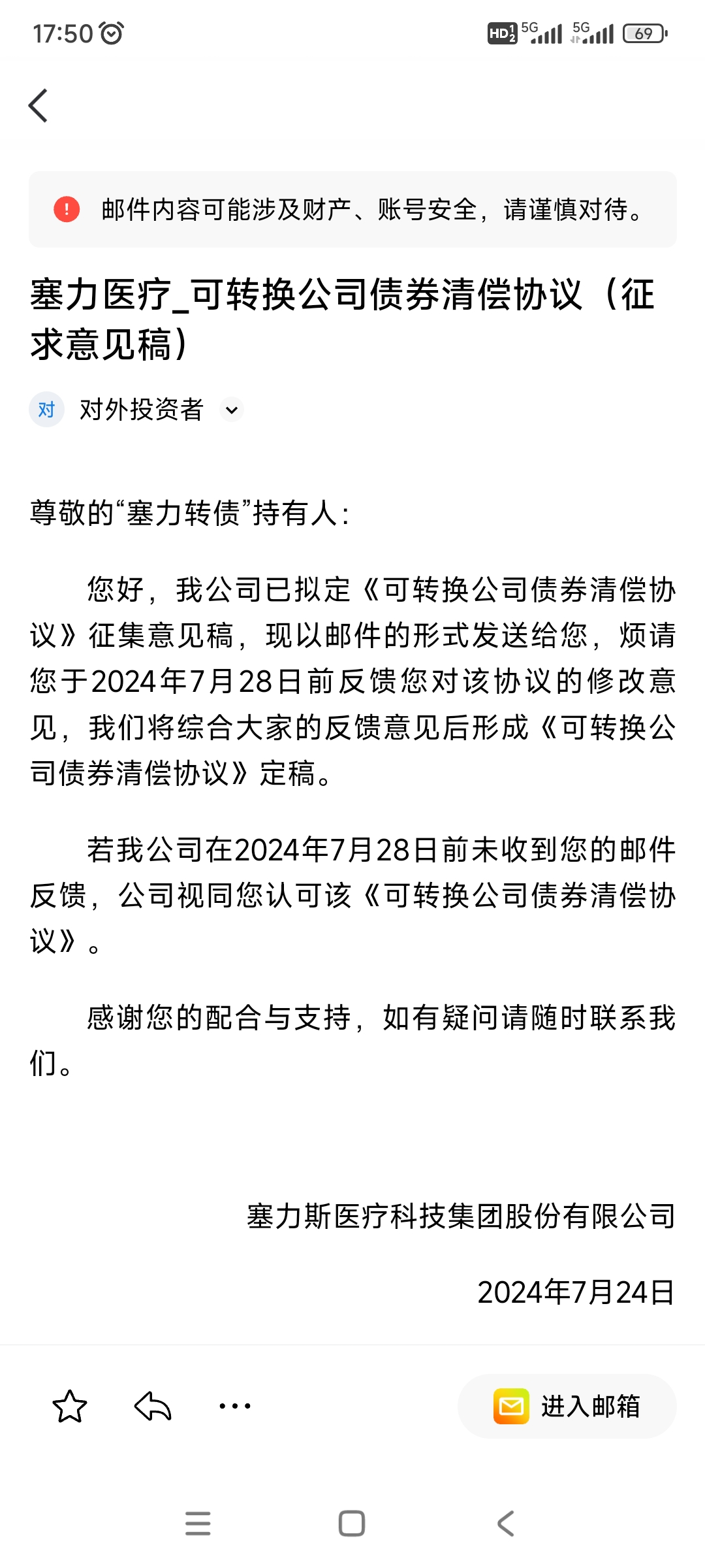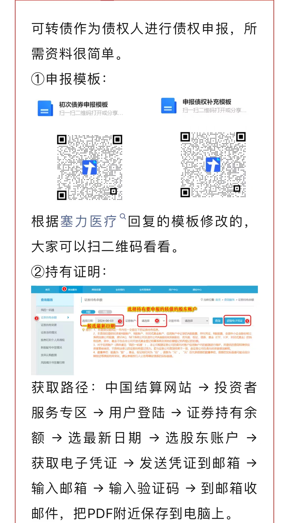 本人为塞力转债持有人 -身份证号码:-已于2024 年5 月 27 日向公司ir@thalys.net.cn邮箱发送本人申报债权的相关材料(以下简称“前次申报”)。截至前次申报,本人共就合法持有的塞力转债550张向公司申报债权,申报债权金额合计为55500元。