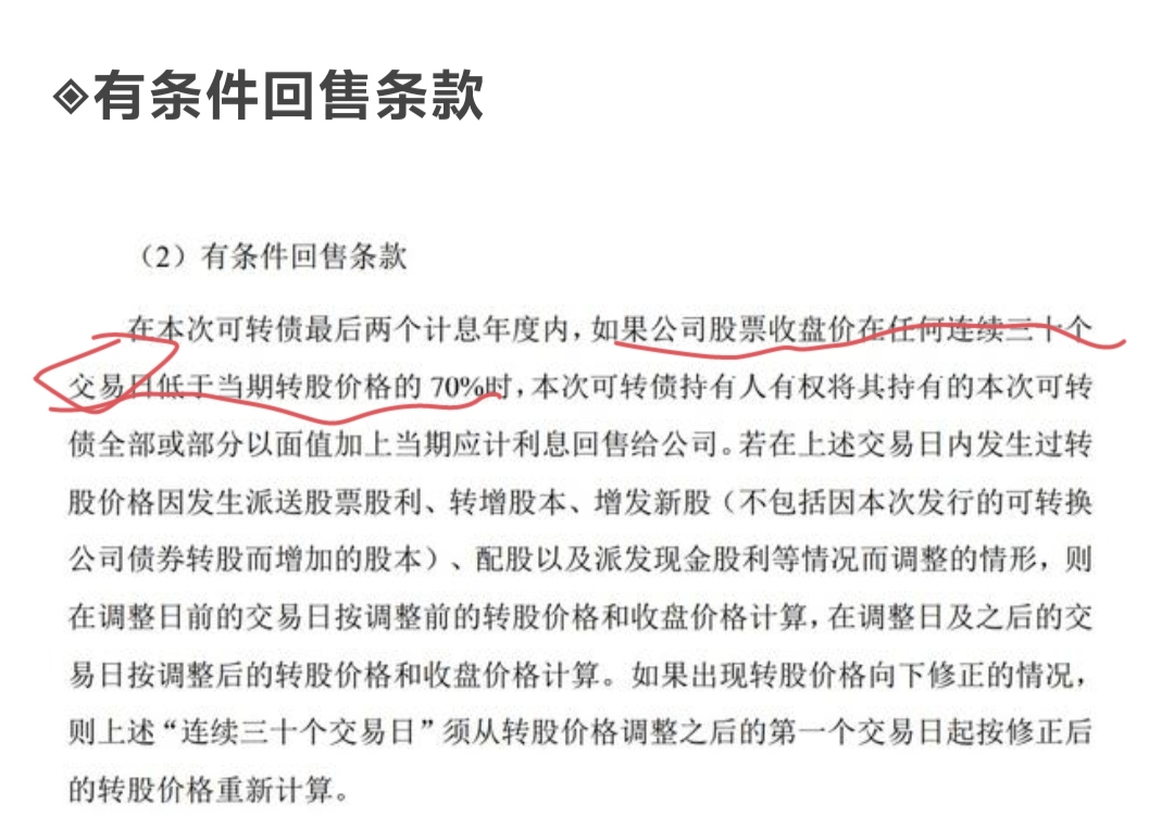 根据募集说明书里面的回售条款:回售条款 (1)有条件回售条款 在本次发行的可转换公司债券最后两个计息年度,如果公司股票在任何连续三十个 交易日的收盘价格低于当期转股价的 70%时,可转换公司债券持有人有权将其持有的可 转换公司债券全部或部分按面值加上当期应计利息的价格回售给公司。若在上述交易日 内发生过转股价格因发生送红股、转增股本、增发新股(不包括因本次发行的可转换公 司债券转股而增加的股本)、配股以及派发现金股利等情况而调整的情形,则在调整前 的交易日按调整前的转股价格和收盘价格计算,在调整后的交易日按调整后的转股价格 和收盘价格计算。如果出现转股价格向下修正的情况,则上述“连续三十个交易日”须 从转股价格调整之后的第一个交易日起重新计算。