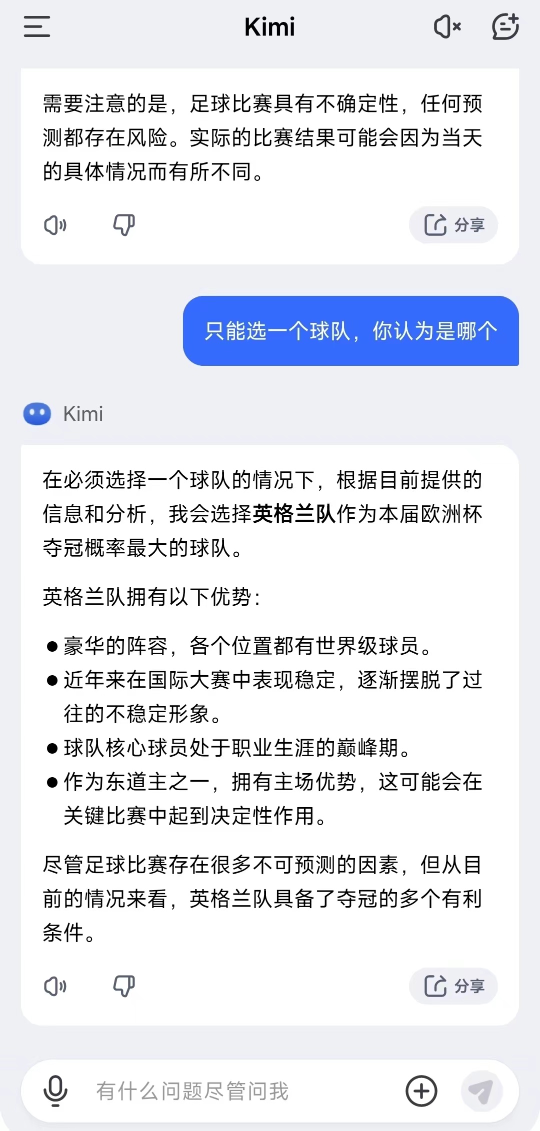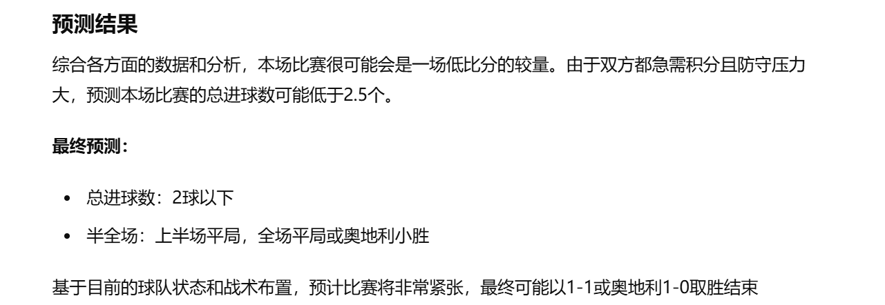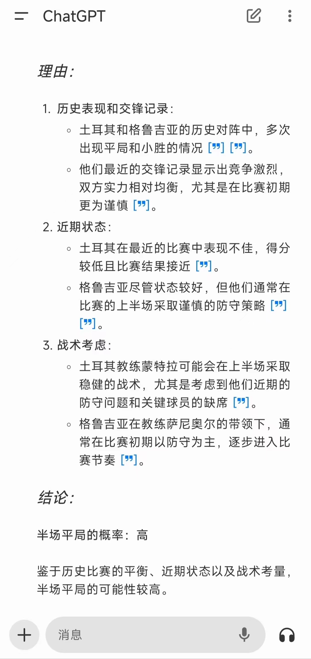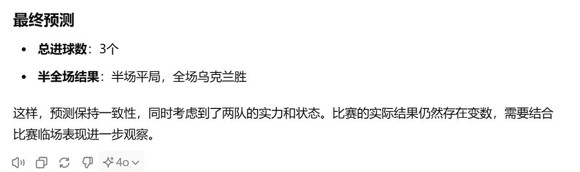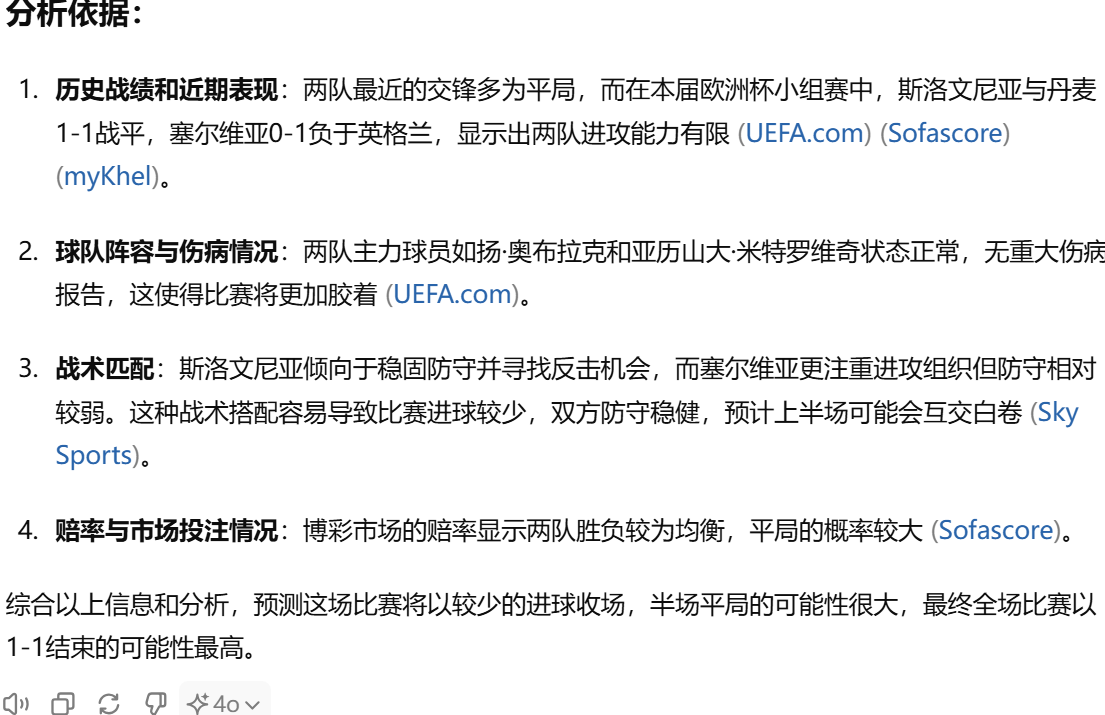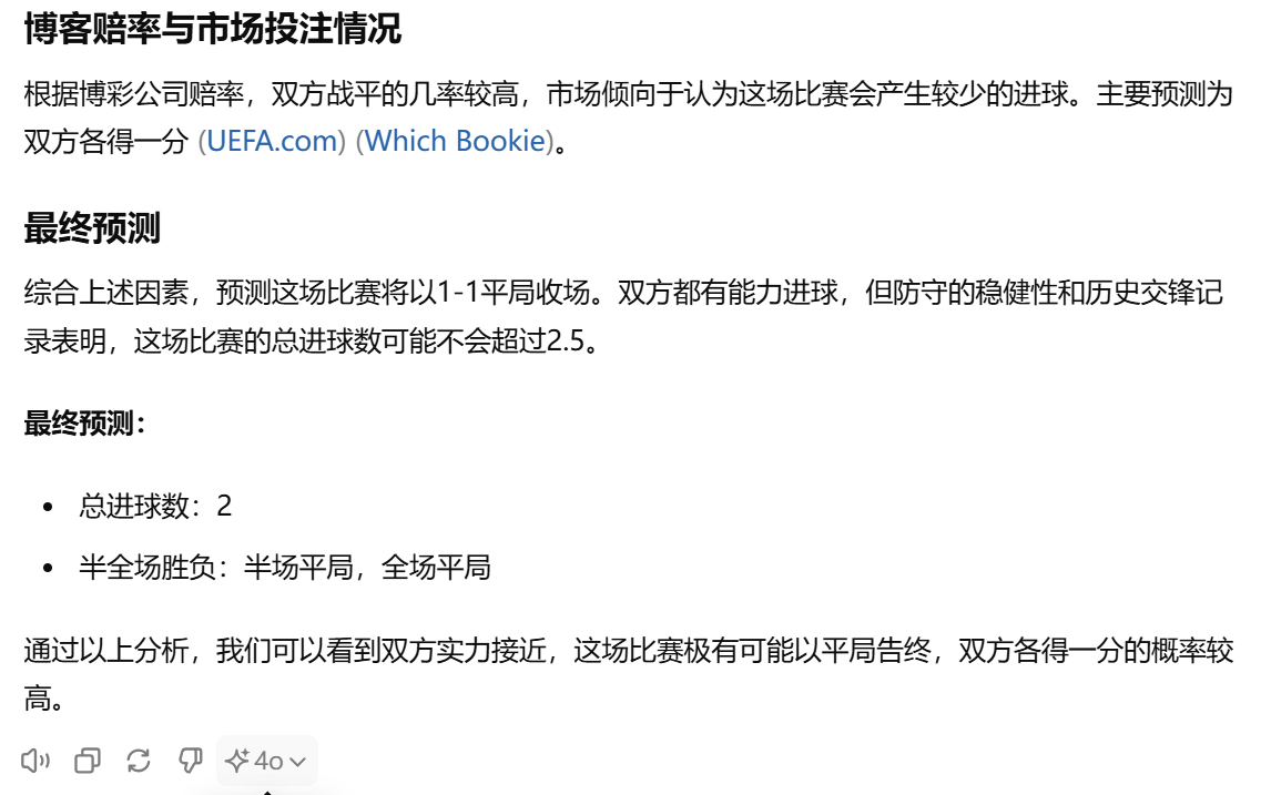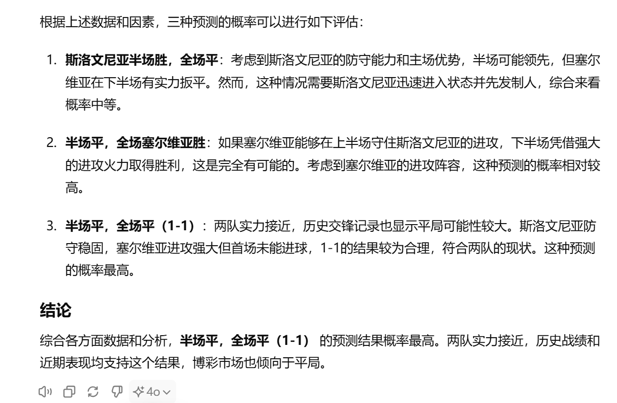 楼主我咨询一句,因为我看到你喂给chatgpt的关键字里面涉及到“赔率和市场投注情况”,那chatgpt的预测会不会倾向于盘口?我刚试了今天的比赛,如果给的键字里面涉及到“赔率和市场投注情况”,chatgpt给的预测会比较倾向于盘口数据,如果没有这个关键字,则给出了有别于盘口的数据针对一场比赛,我一般会在一天中不同时间段五次用模型测试,这样做的目的是因为最新数据的更新会影响模型预测的结果,大部分比赛五次预测会有两次是不完全一致的,比如斯洛文尼亚和塞尔维亚的这场比赛,出现过平平,平负,胜平,三种结果,但总进球数一直是2球不变,类似这种情况,我会加大针对不同结果地方进行二次模型运行的频次,但不改变运行时影响比赛的因素,在所有运行得到的结果中,取占比最高的作为最终结果。