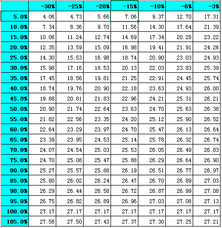 然后同时发现楼主的某些格可能错了,最简单的判断法,100%收走的时候,盈亏平衡是27.17,那一行怎么还会有低于27.17的数字呢?(楼主大概率-30%、-25%跌幅的列数据有错误)