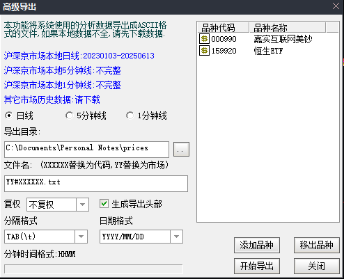 最后,我发现自己用的券商PC版交易软件基于通达信引擎,它的菜单中有数据导出功能,可以批量的把自选品种的历史价格导出到文本文件中,支持A股、港股的股票、可转债、基金。导出以后可以写代码读取文本把价格输入记账数据库,也可以粘贴到Excel再批量处理。我估计其他多数交易软件也有类似的功能,这可能是最适合普通用户批量获取价格数据的方式。