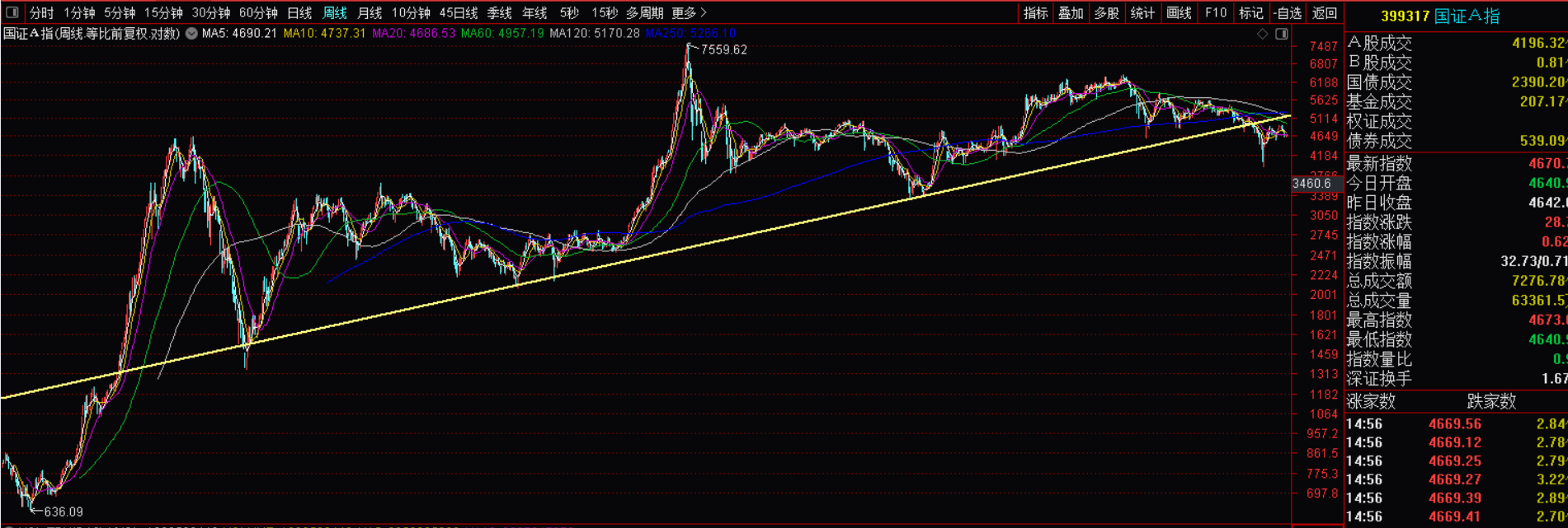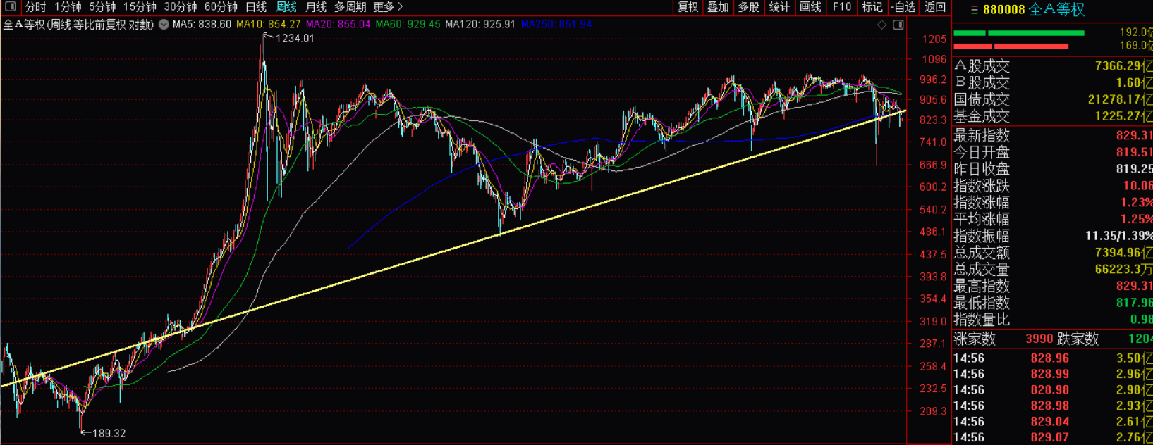 所以当我们看向全市场的时候,看“国证A指”、“全A等权”都要比上证、深证这些要靠谱,而这两者走势是这样的: