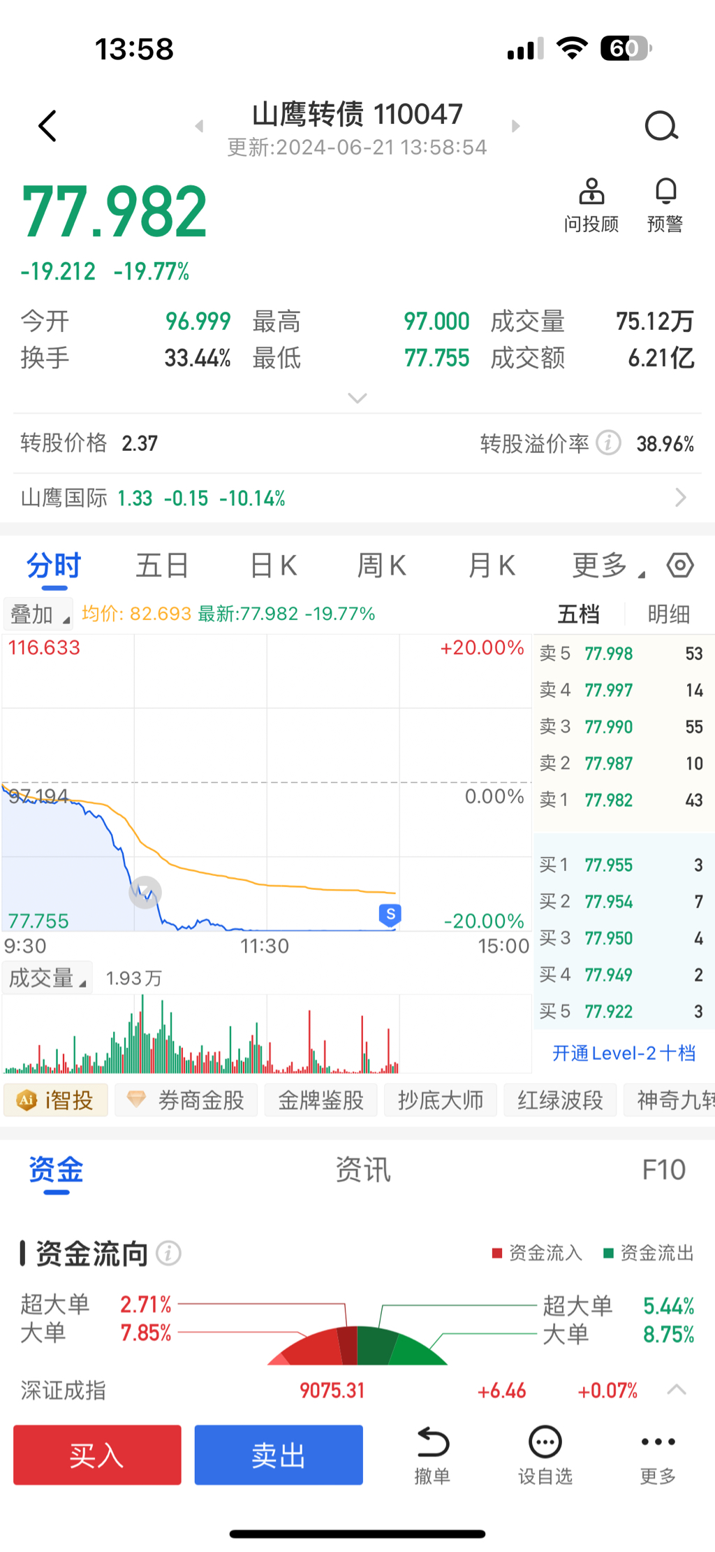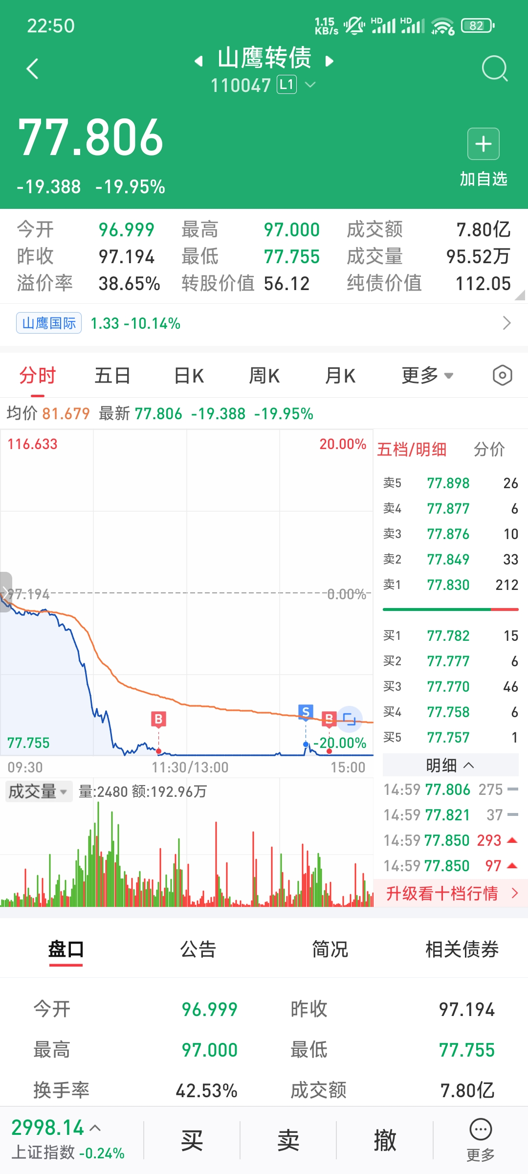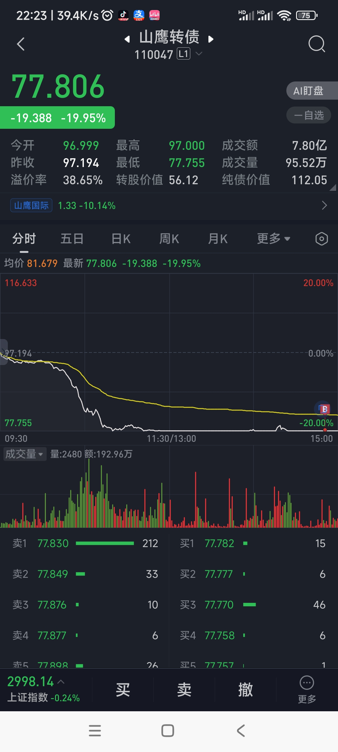 先把77的卖了 然后去买64的鹰19转 等70多的跌到50或者比鹰19转更低了再倒腾回去 一来一去20%利润呢照样能赚钱