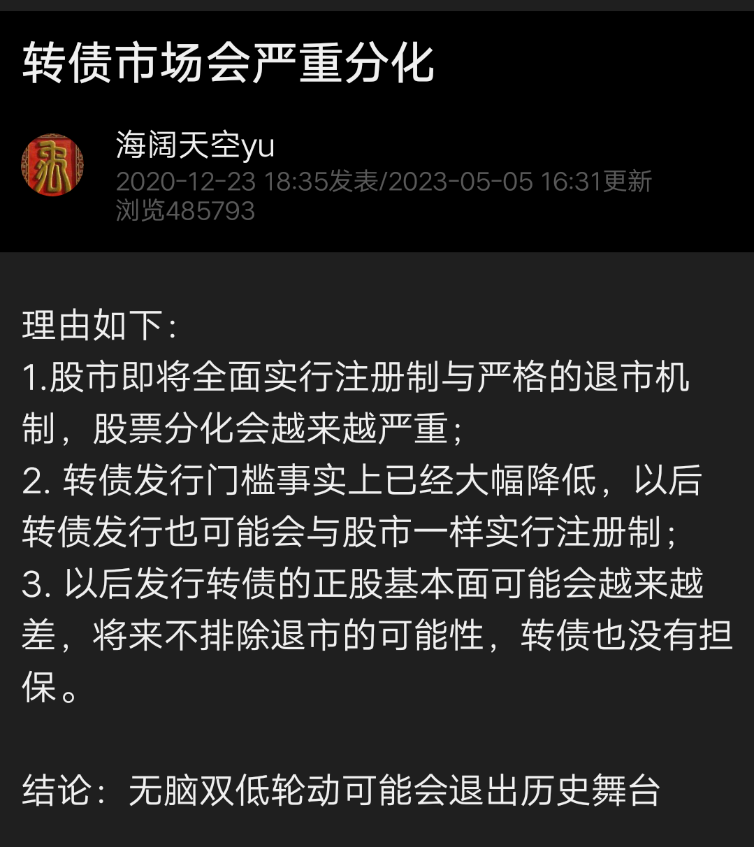 真正害人的是“刻舟求剑”,以前之所以“烂股好债”是因为没有全面实行注册制与严格的退市机制,全面实行注册制与严格退市机制之后必然会导致转债市场严重分化,一些转债会随正股退市。