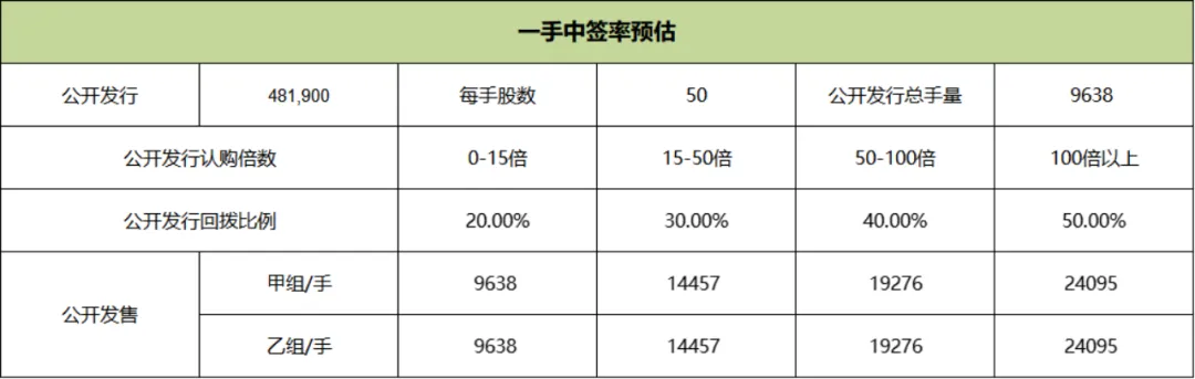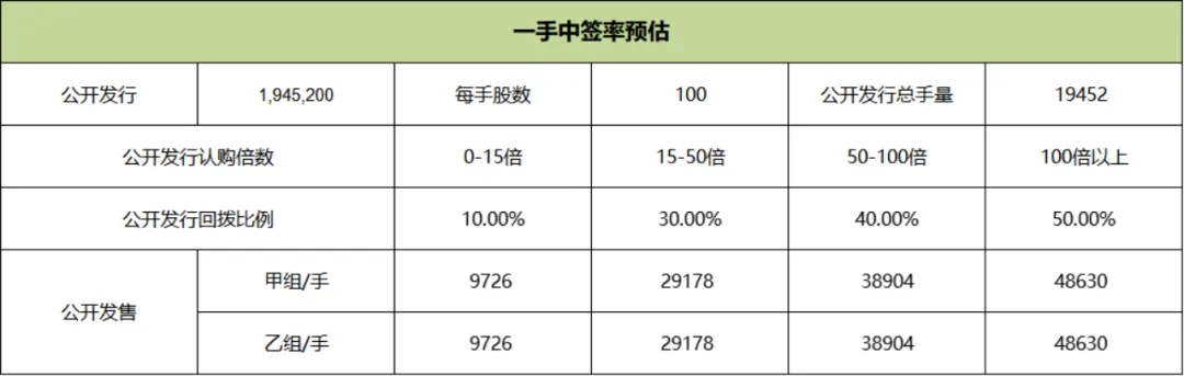 公开发行总计390.95万股,每手500股,公开发行总计7819手,当前超购 32倍,假设8000人申购,一手中签率60%。