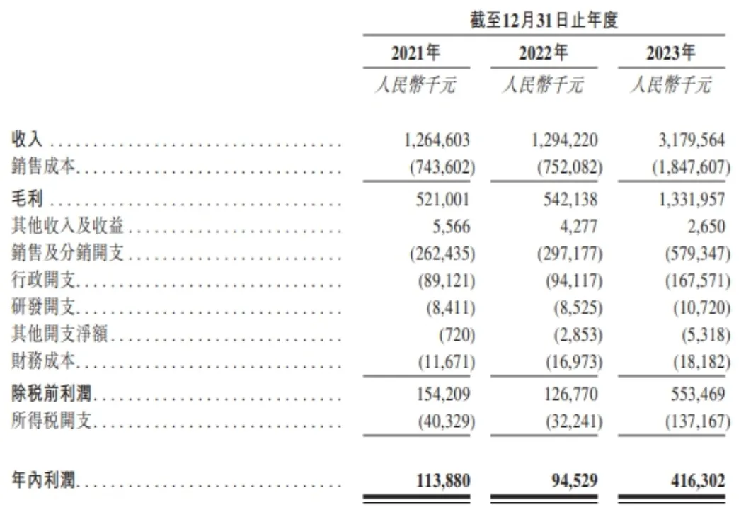 公司收入从2021年的人民币12.646亿元增至2022年的人民币12.942亿元,并于2023年进一步增至31.796亿元,2021年至2023年的复合年增长率为58.6%。