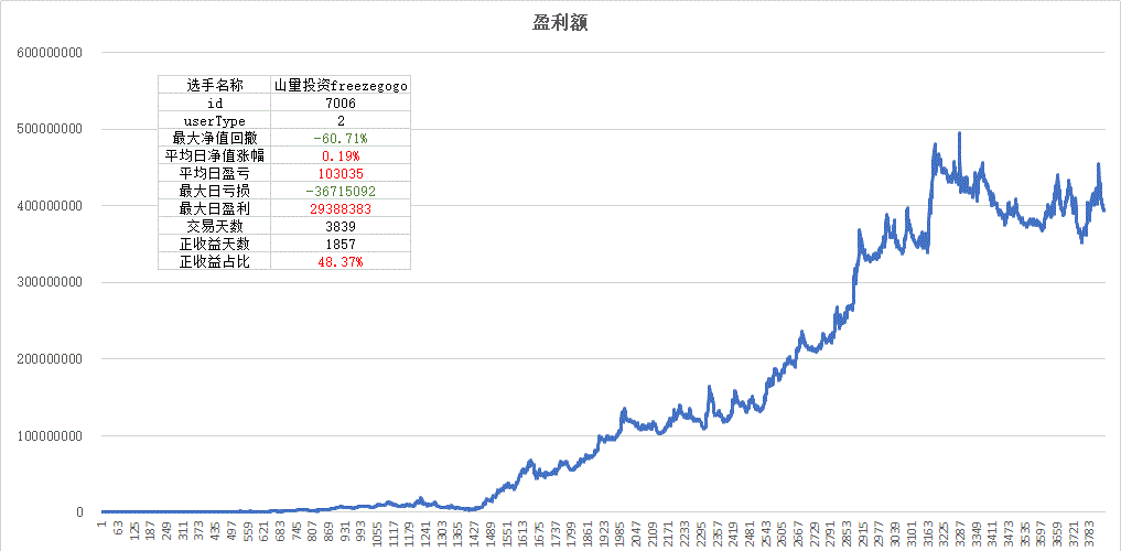 最近抓取了蓝海密剑实盘比赛前几名的比赛数据,其中“山量投资freezegogo”的数据很有参考价值,从2008年开始,启动资金不到30万,到现在盈利近4个亿,亏损最多的一天是2022/03/10,亏损了-3671万,而且还连续亏损,5天亏了7777万。