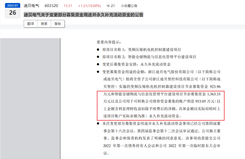 迪贝电气关于变更部分募集资金用途并永久补充流动资金的公告