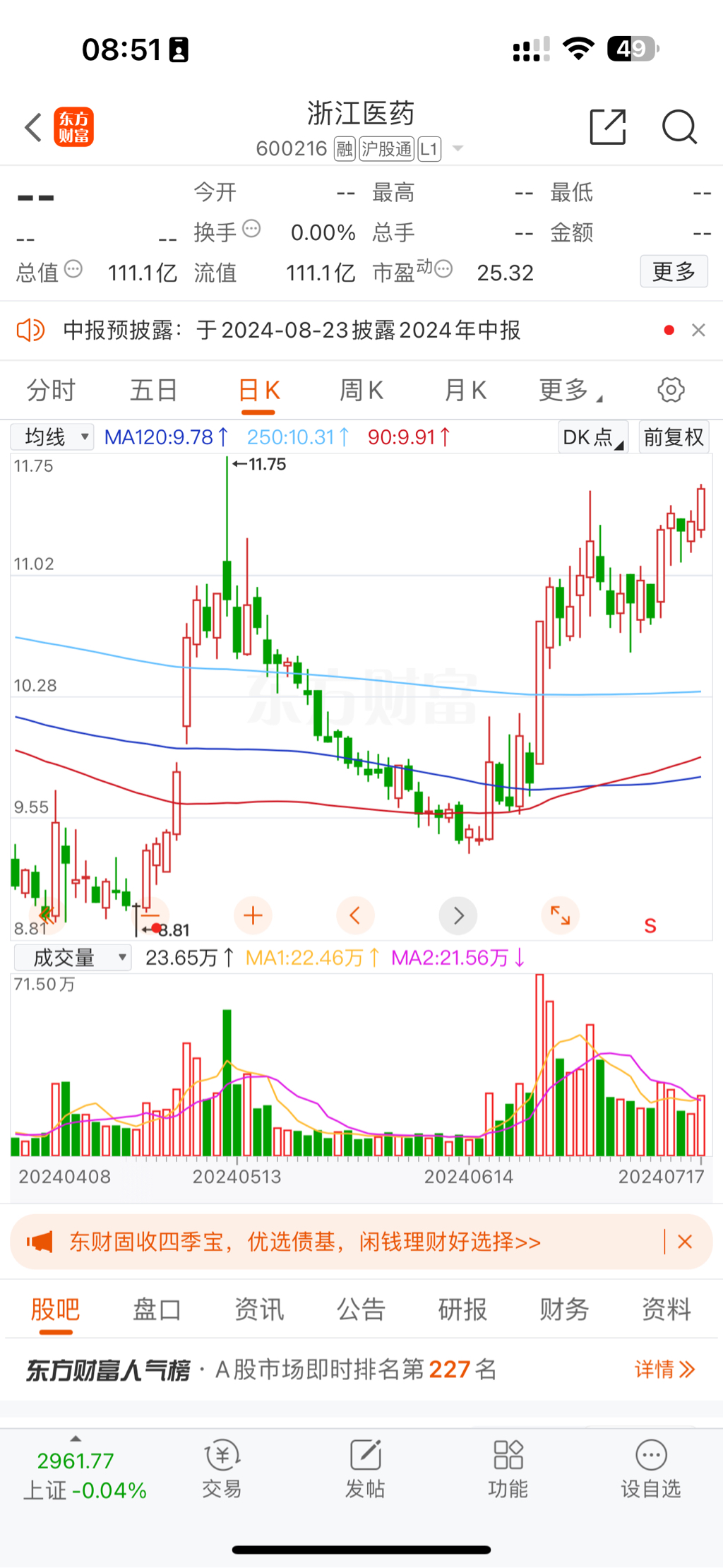 对于浙江医药,如果我是新玩家,我会死死拿着,因为中报行情,但是从我的做t系统来说应该先卖出手,等下来在接回去,毕竟量少势大