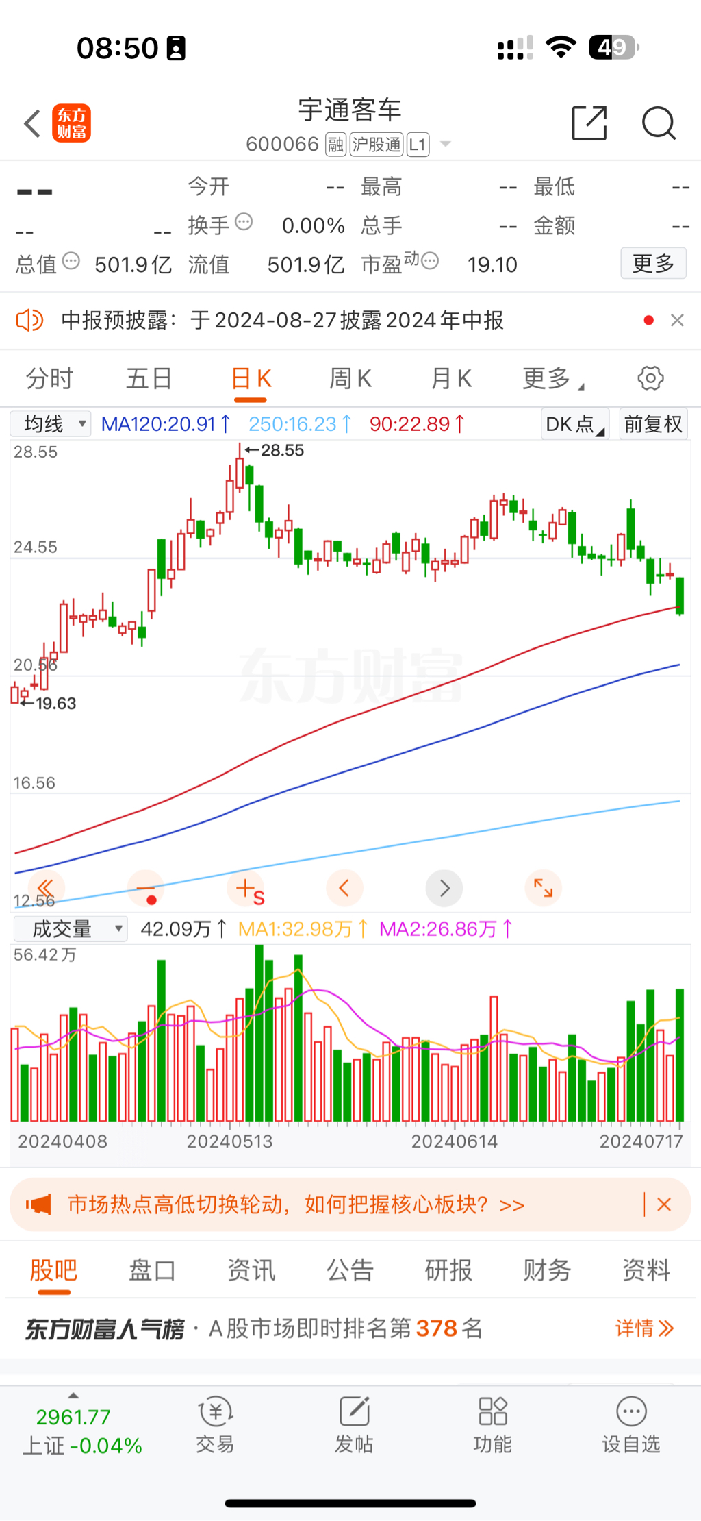对于宇通客车,对于新玩家来说,因为它之前涨到了31,后面跌到28时候以为机会来了,所以目前在被套着,哪怕现在大跌也会死死拿着。如果我是庄家,我会大量出货,因为他们被套着,总有人会加仓来期待解套