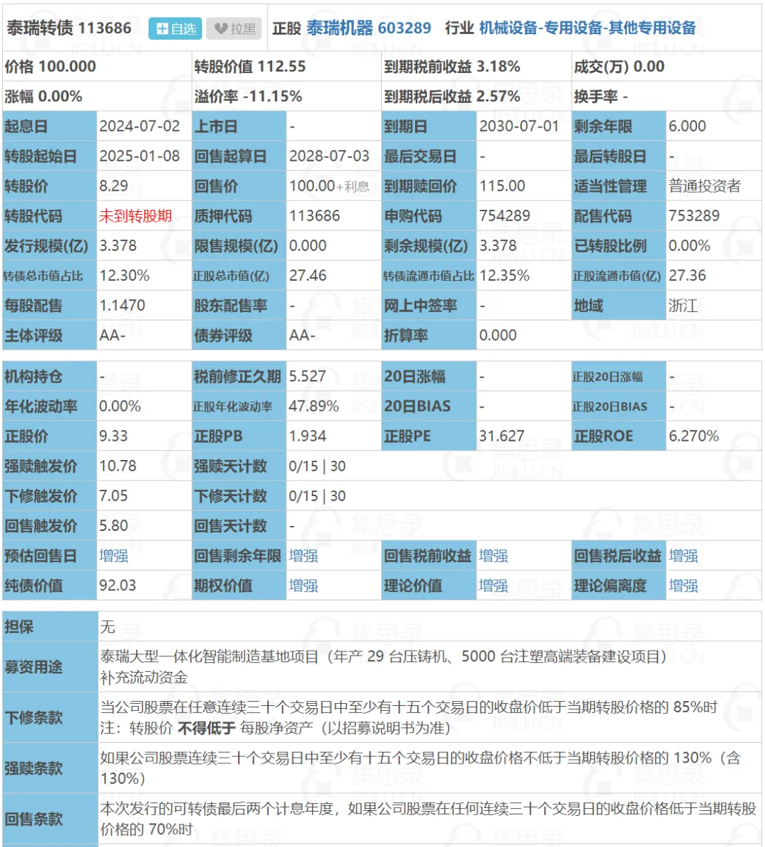 泰瑞转债:(正股代码:603289,配债代码:753289)