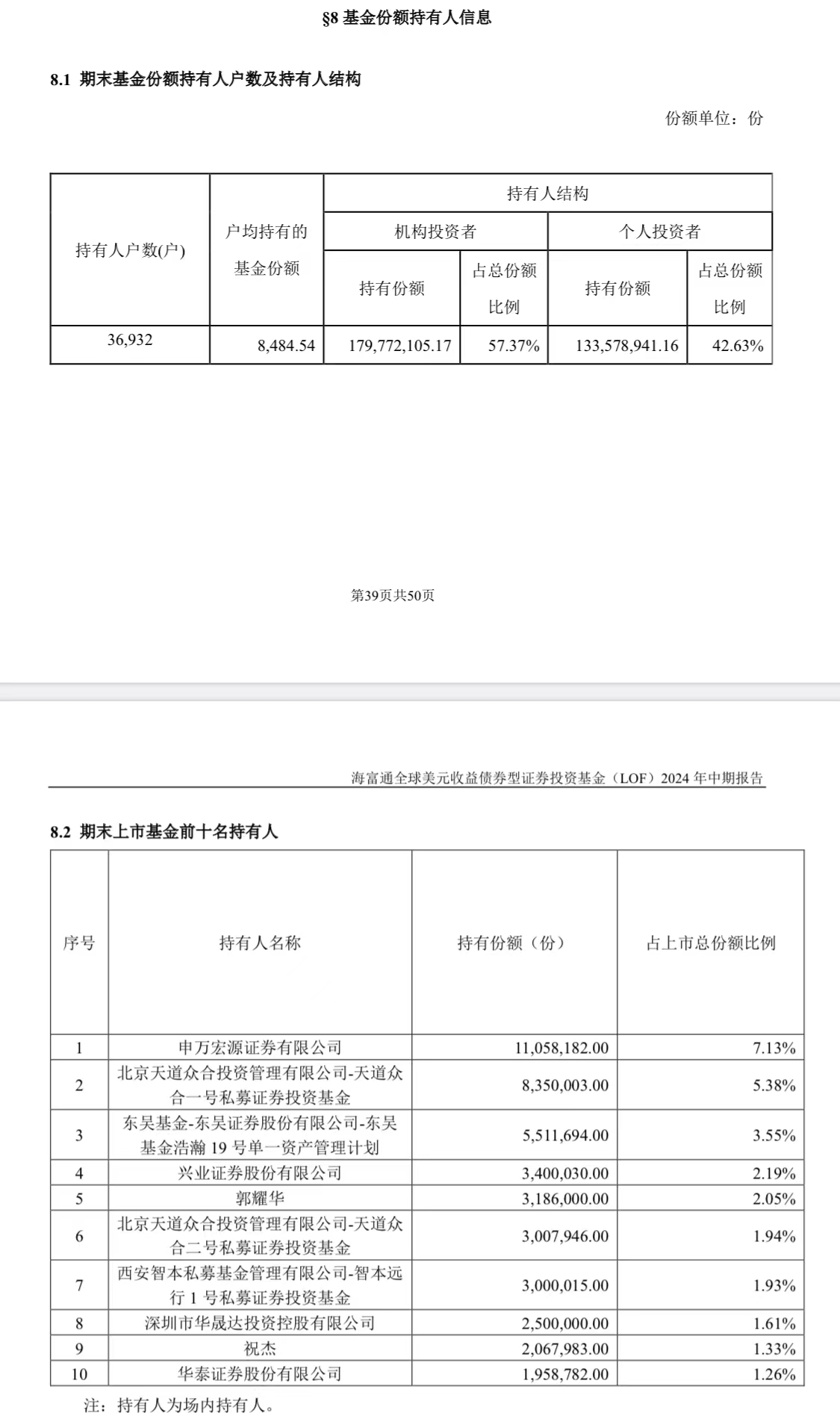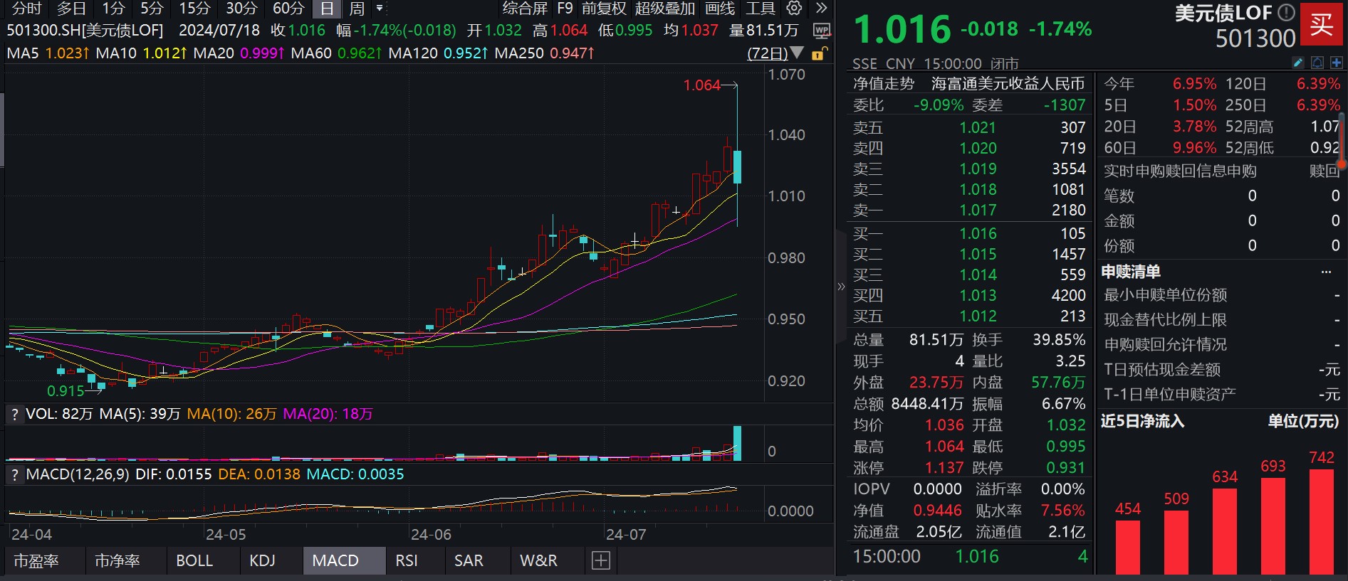 2024年7月17日,美元债LOF场内份额20,453.04万份,新增721.02万份,1个身份证申购100元,相当于6.80万人申购。