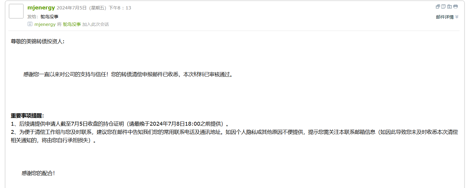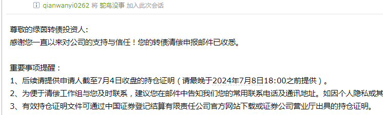 今天继续加仓了,打通了客服 说钱没问题 不用操心,然后今天买入的一样可以清偿。。截至到2024年7月5日,持有贵公司美锦转债可转债23347张。 申报清偿债权2334700元,(因是今天购买的中登数据暂无,上传的是证券的截图和之前19937张的中登截图)