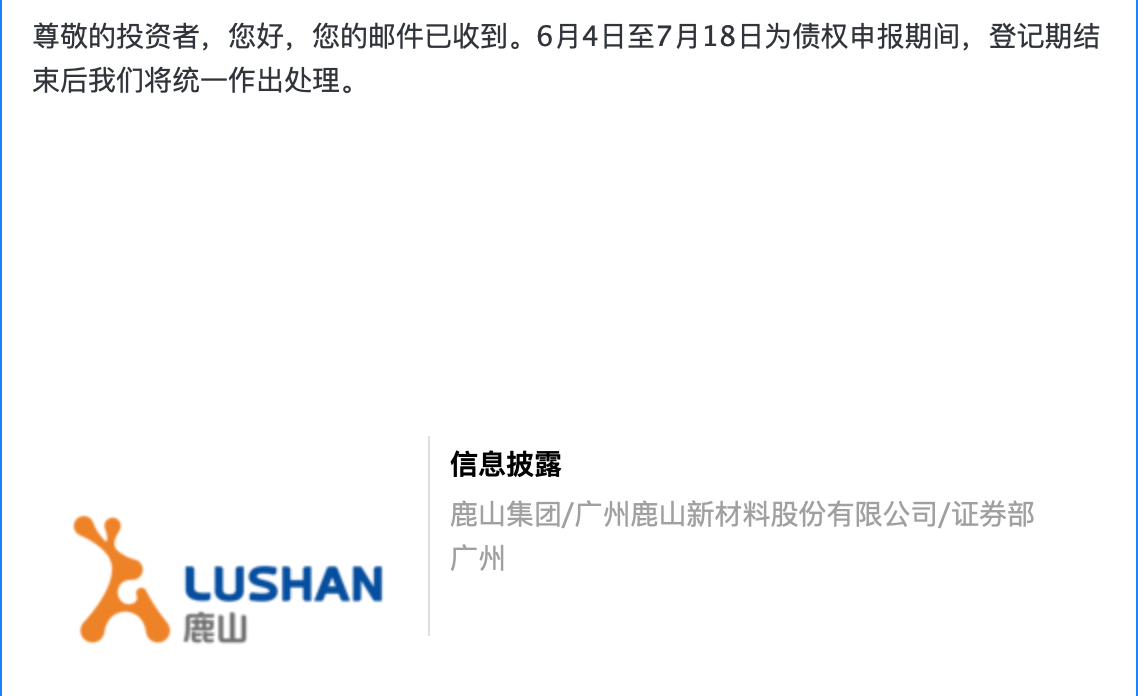鹿山转债债权申报期为6月4日至7月18日。今天是申报期最后一天。申报债券较早的投资者假如在7月18日收盘之前又卖出导致持仓量变化的,一定要给给公司发个“关于债权申报数量变更说明”,同时提供7月18日收盘后最新的鹿山转债持仓证明。