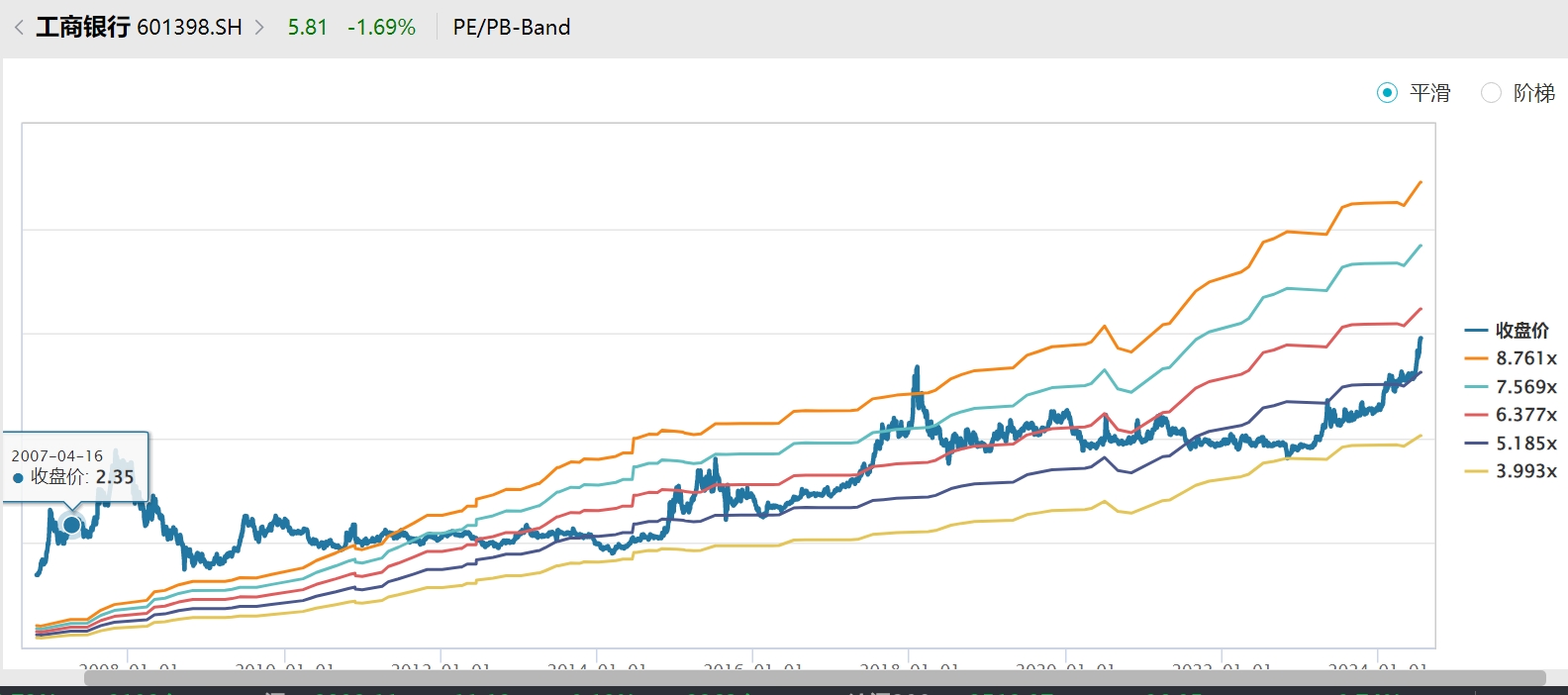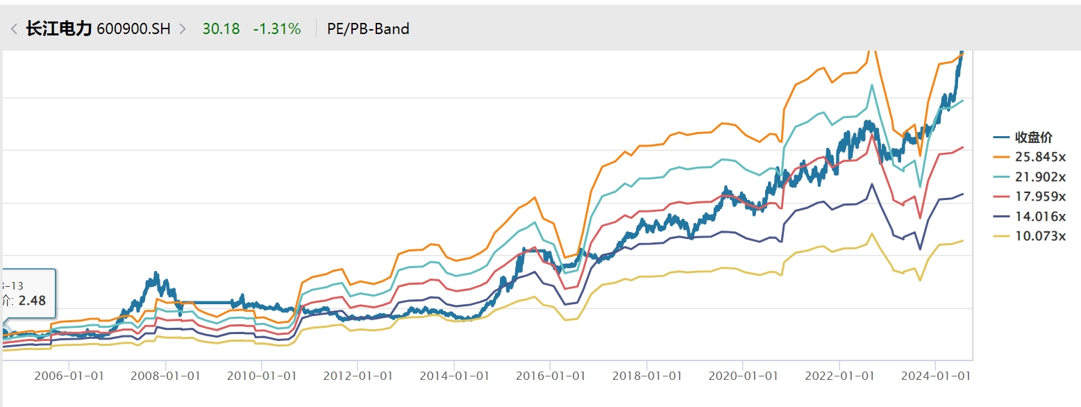 长江电力和银行是很不同的生意,长江电力2023年之前的资产负债率约40%,或者杠杆不超过170%,而银行的资产负债率却长期高于90%,或者说杠杆不低于1000%。银行不是没有过高估值时期,但那个时候经济高速发展,银行资产质量无忧,银行净息差可以到2.5%以上,现在呢?附上长江电力和工商银行的PE bond,长江电力的估值中枢跟工商银行一直不在一个水平上。