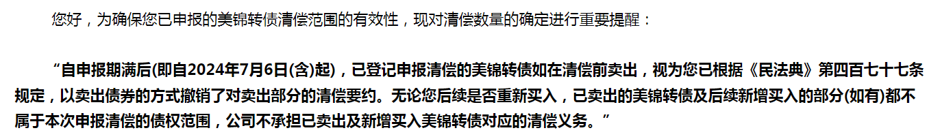 “自申报期满后(即自2024年7月6日(含)起),已登记申报清偿的美锦转债如在清偿前卖出,视为您已根据《民法典》第四百七十七条规定,以卖出债券的方式撤销了对卖出部分的清偿要约。无论您后续是否重新买入,已卖出的美锦转债及后续新增买入的部分(如有)都不属于本次申报清偿的债权范围,公司不承担已卖出及新增买入美锦转债对应的清偿义务。”
