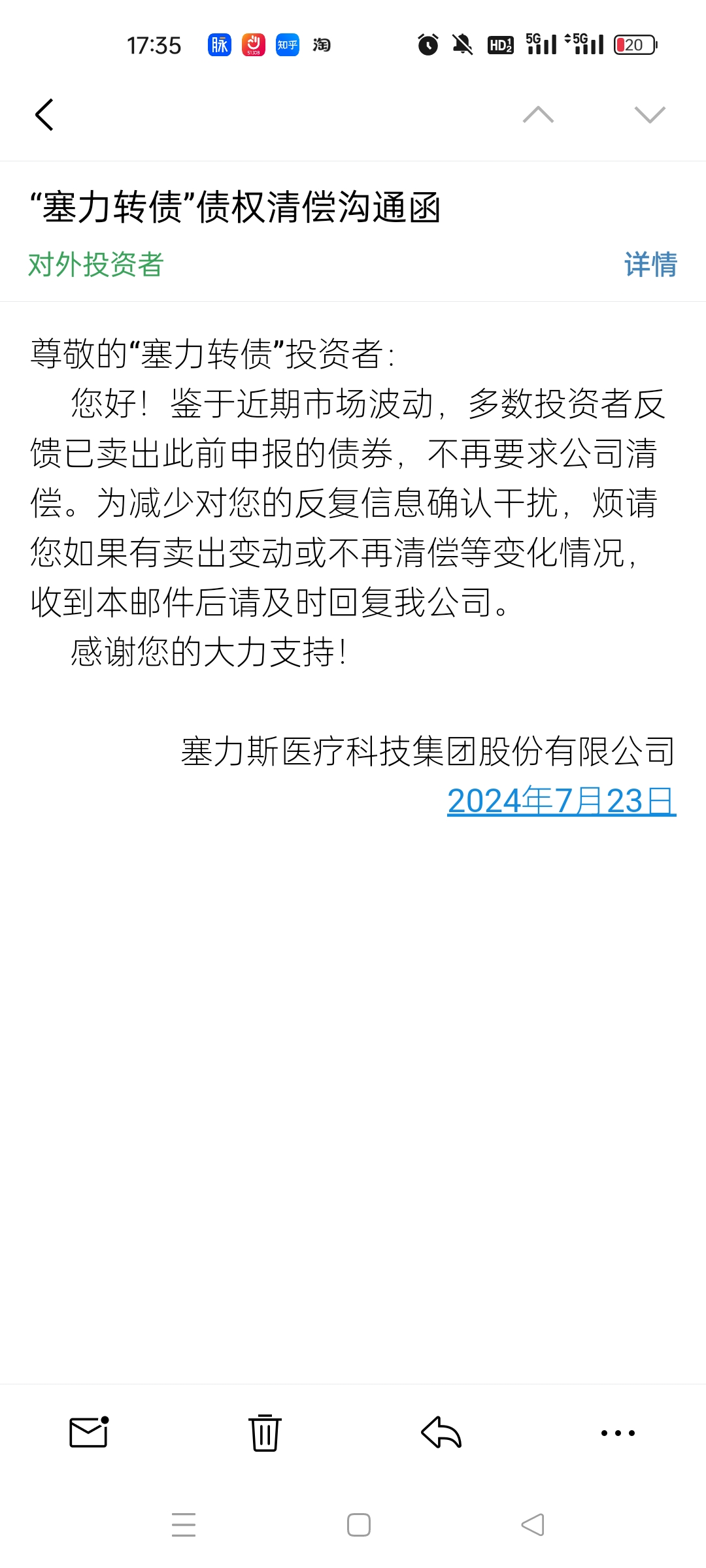 您好!鉴于近期市场波动,多数投资者反馈已卖出此前申报的债券,不再要求公司清偿。为减少对您的反复信息确认干扰,烦请您如果有卖出变动或不再清偿等变化情况,收到本邮件后请及时回复我公司。