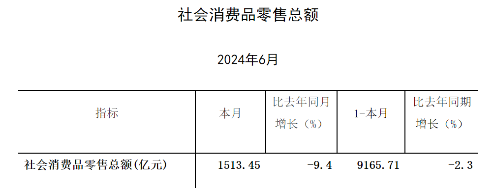 社会消费品零售总额(亿元) 1513.45 -9.4 9165.71 -2.3
