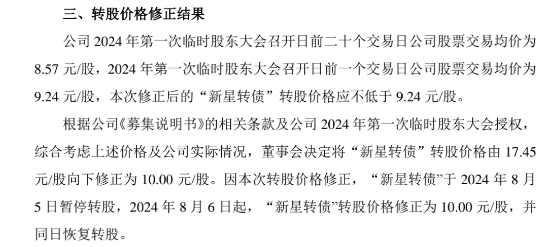 23年报审计的净资产也就8.91,目前可转债价90元出头,下修时净资产限制不是主要矛盾(此次下修至10元你不乐才怪)。不至于你所谓的按净资产要求新星就废了的言论,不要不懂瞎BB我计算的23年每股净资产是9.6,你这个数据8.91值得商榷。