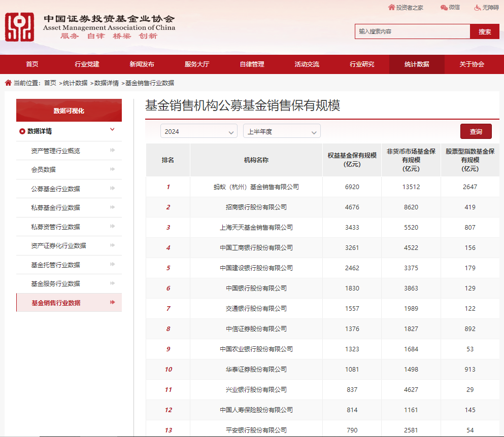 2024年6月末,蚂蚁(杭州)基金销售有限公司权益基金保有规模6920亿元,排名第1。招商银行股份有限公司权益基金保有规模4676亿元,排名第2。